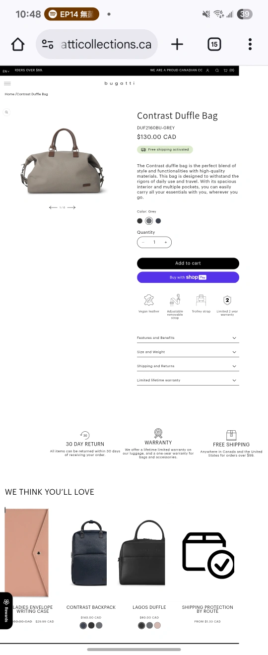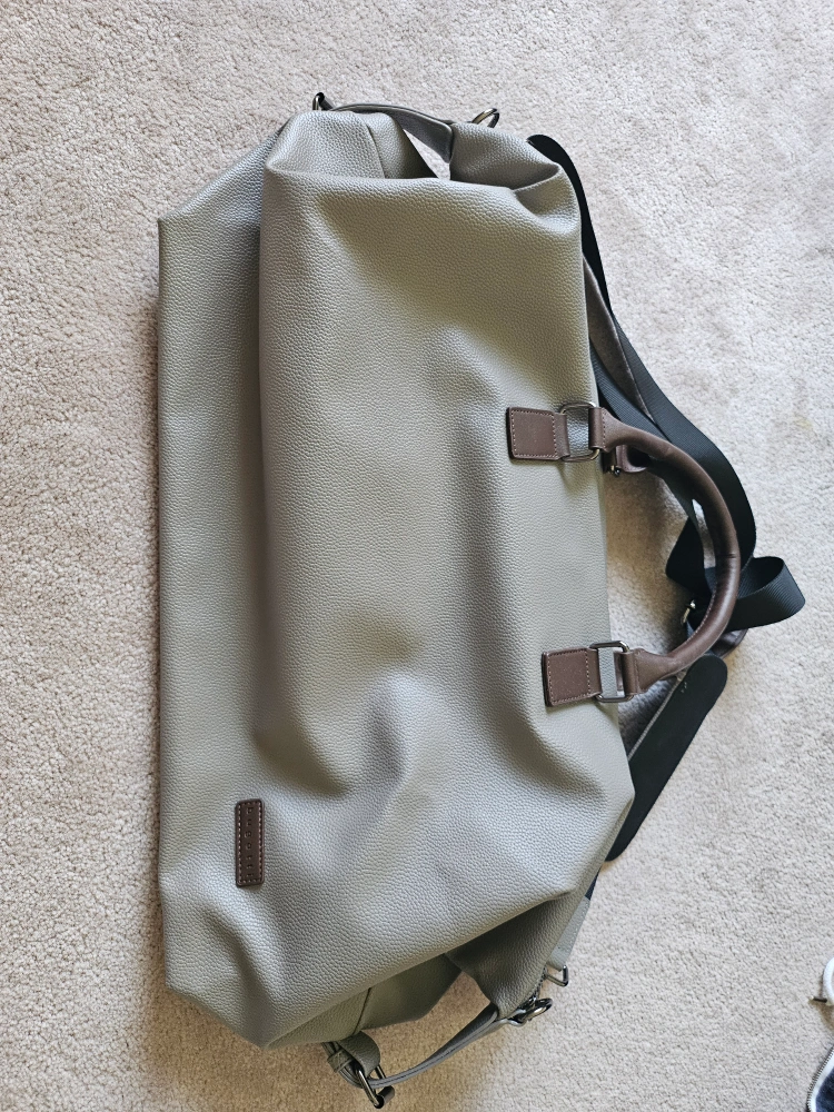 A lovely, neutral duffle bag with a spacious interior. Features top handles and an adjustable shoulder strap for convenience. This bag would be excellent for weekend getaways or overnight trips.