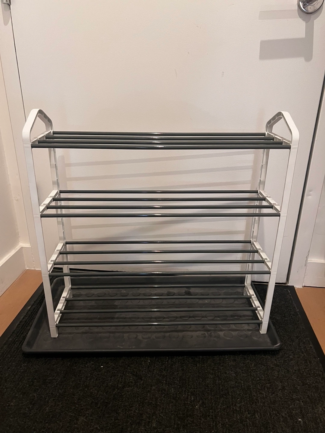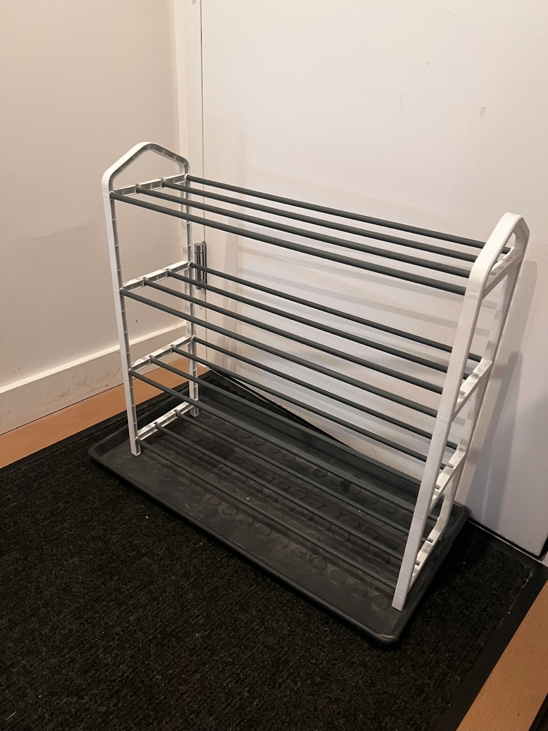 A multi-level shoe rack. Featuring a black base and a white frame. Metal rods across each level for shoe storage. The perfect solution to keep your space tidy.