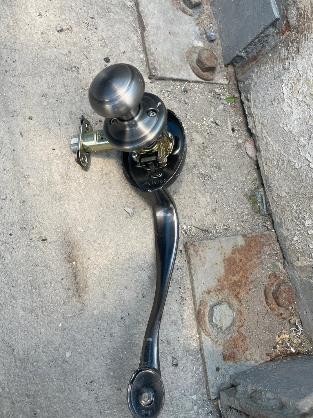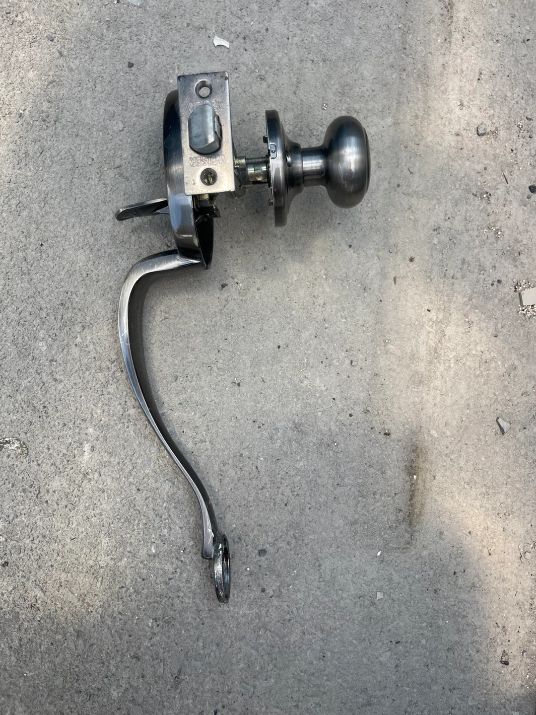 Complete door handle set. Includes a handle, a knob, and the internal mechanism. Sleek, modern design. A great addition to any space, offering both style and functionality.
