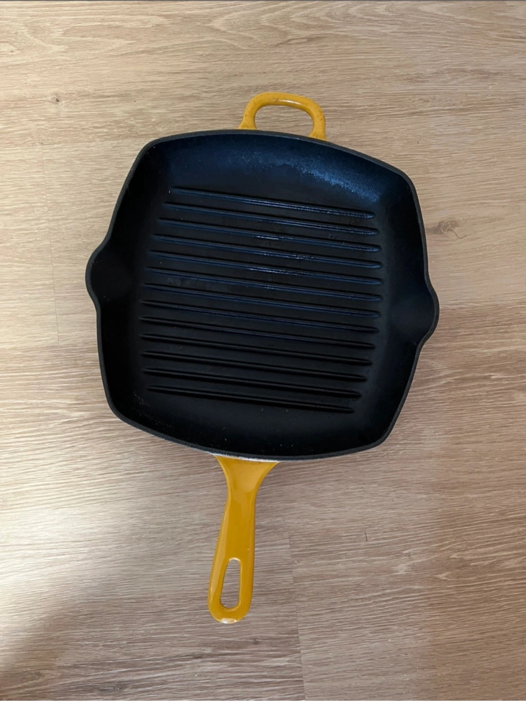 Well-loved Chuck Hughes cast iron square grill pan. Yellow enamel exterior. Shows signs of use. Great for grilling vegetables and meats. Adds character to your kitchen. Can be used on stove or in oven or BBQ