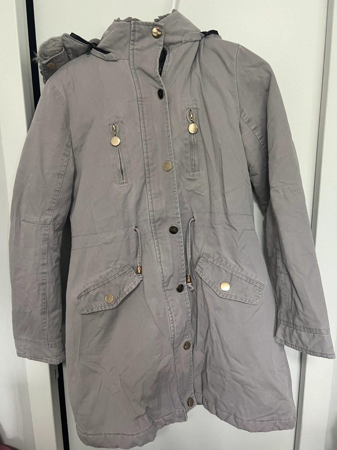 A beautiful grey winter parka. Features a faux fur-lined hood. Gold-toned zipper and button details. Great for a cozy walk through a winter wonderland.