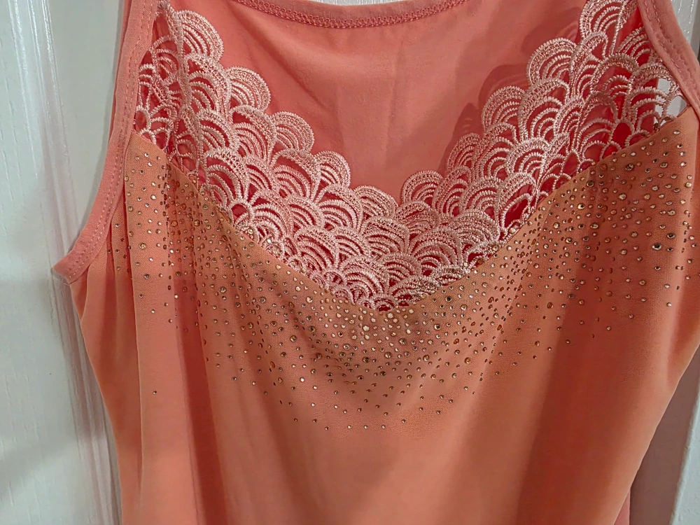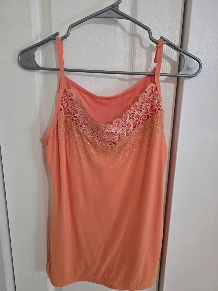Coral cami top. Delicate spaghetti straps. Features a detailed lace design at the neckline, embellished with small, scattered beads. It could be a lovely piece to wear for a special occasion