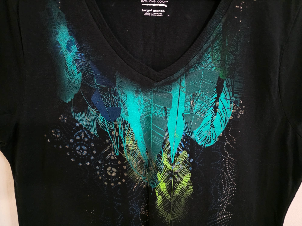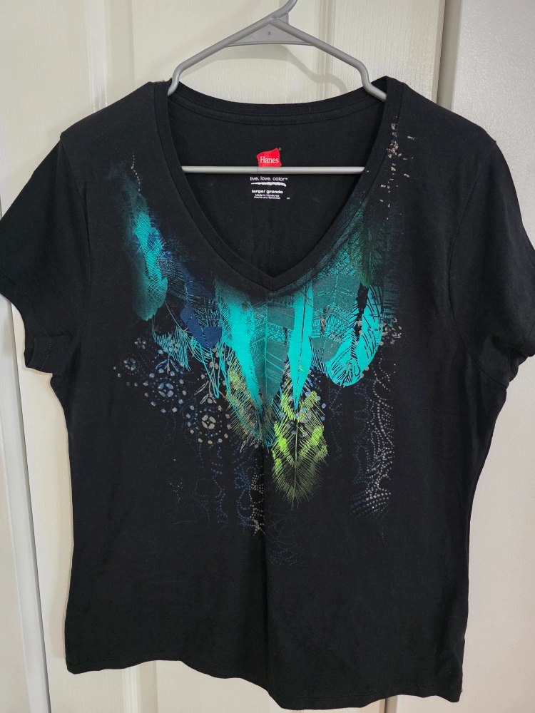 Black t-shirt with a V-neck. Featuring a colourful feather design on the front. A comfortable shirt for everyday wear.