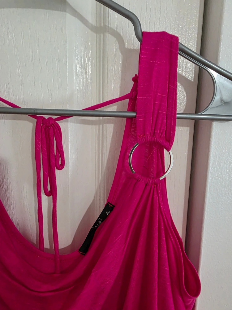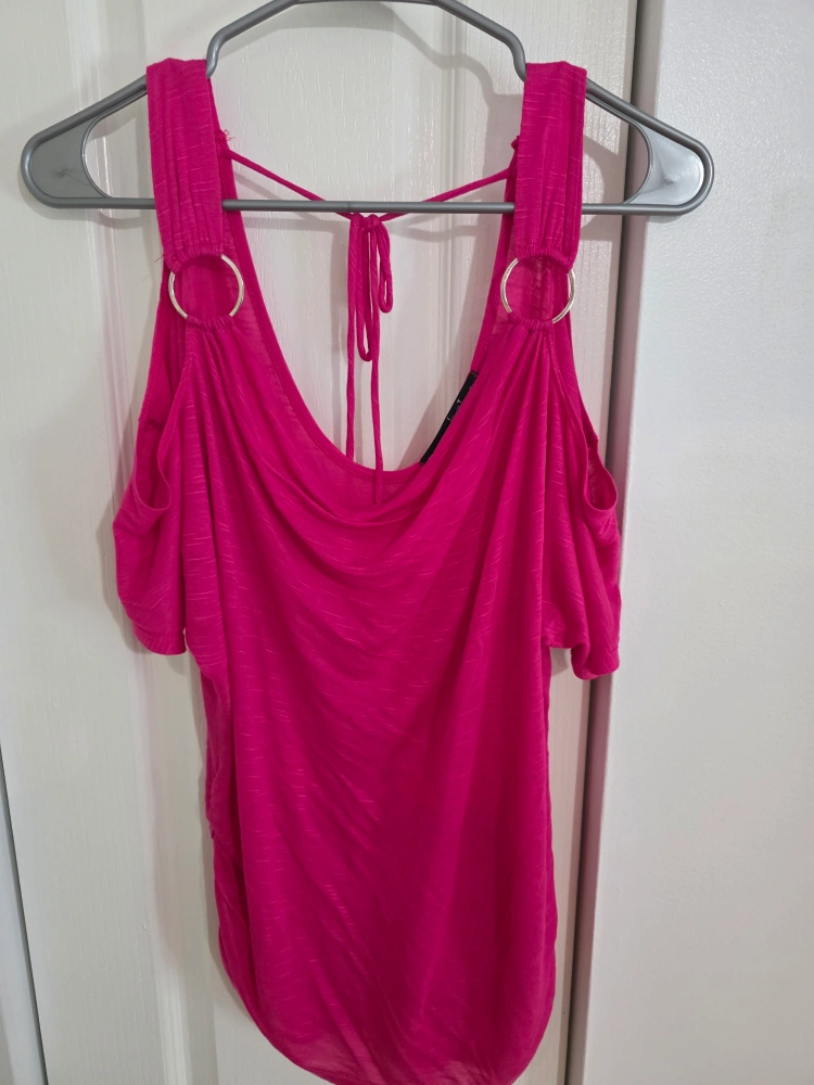 Pretty pink top with ring details and shoulder cut-outs. The back has tie detailing. This is a perfect top to wear for a night out, or any occasion where you would like to feel relaxed and comfortable.