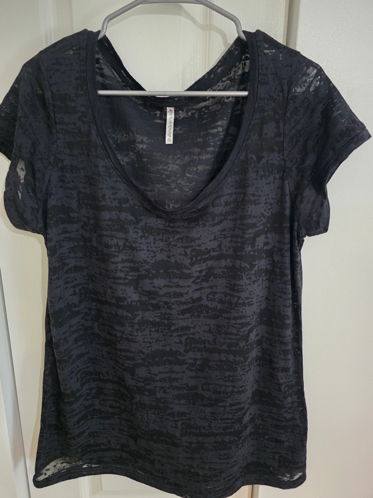 Black top with short sleeves and a scoop neckline. The material has a unique textured pattern. Wear it on a hot summer day