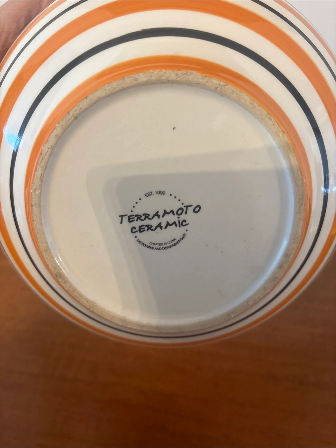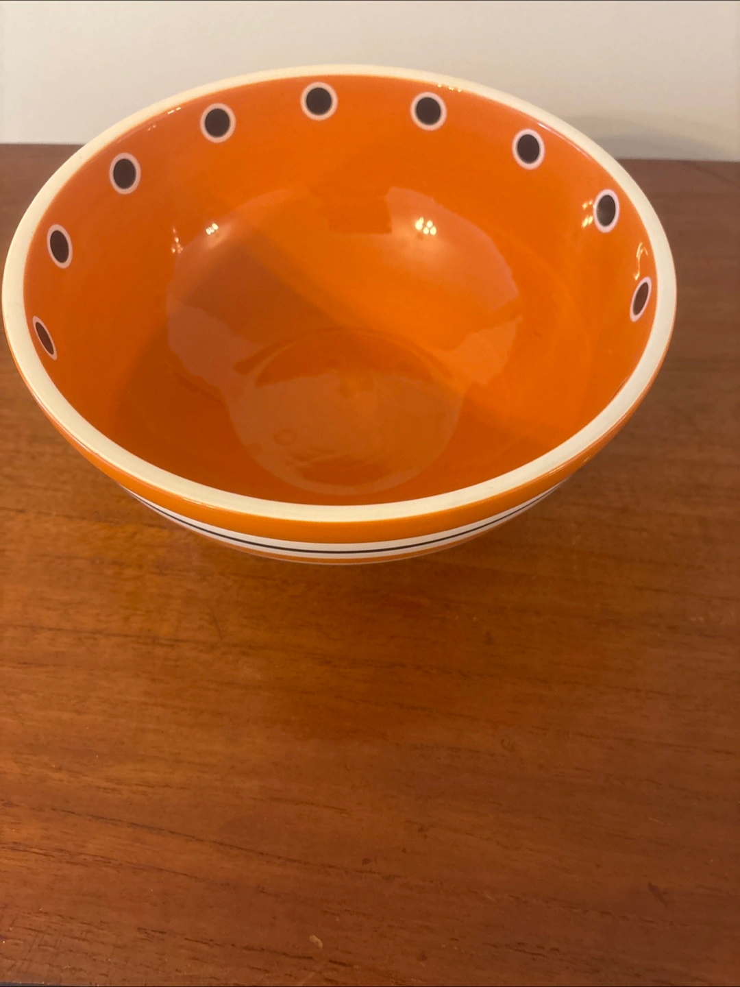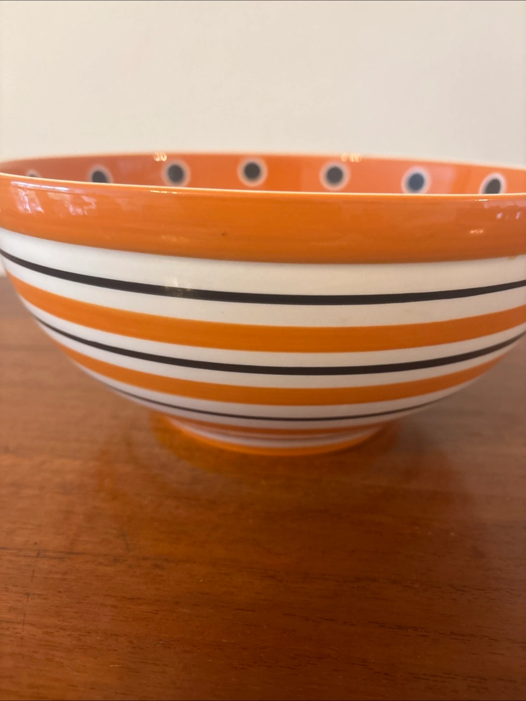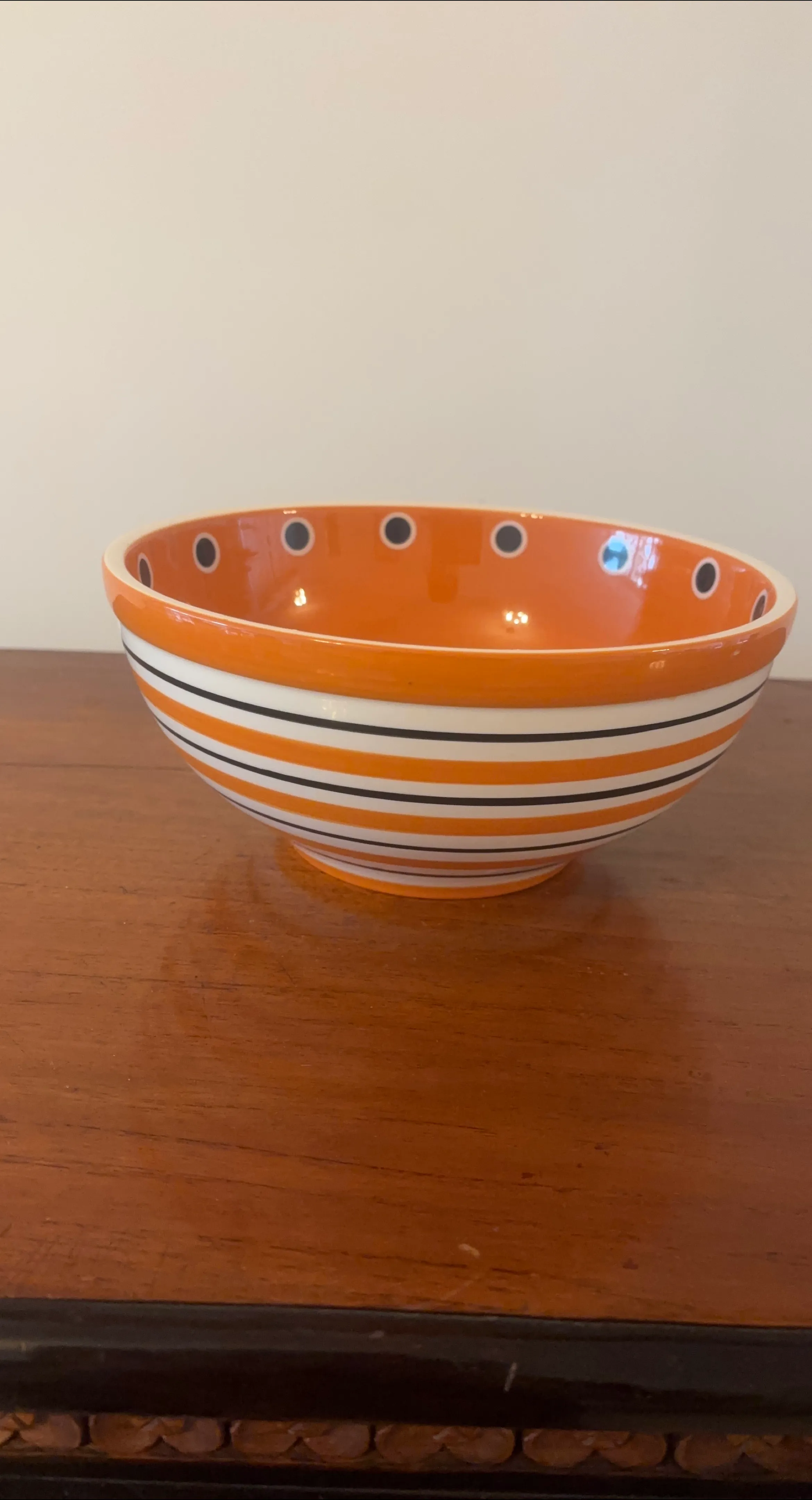 Beautiful orange and white striped bowl. Features black dots around the rim. Microwave and dishwasher safe. Using it can be a wonderful experience when you're craving a warm bowl of soup.