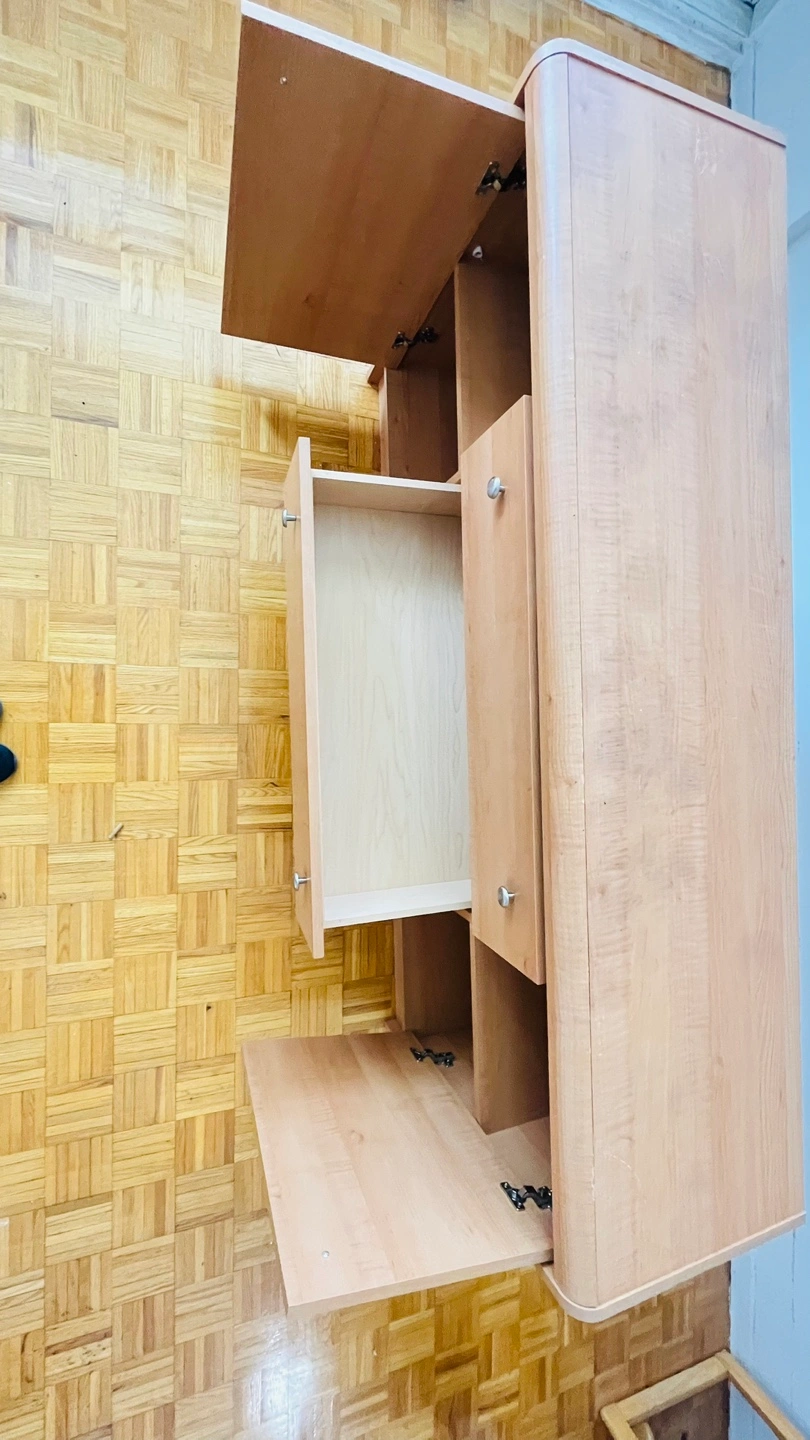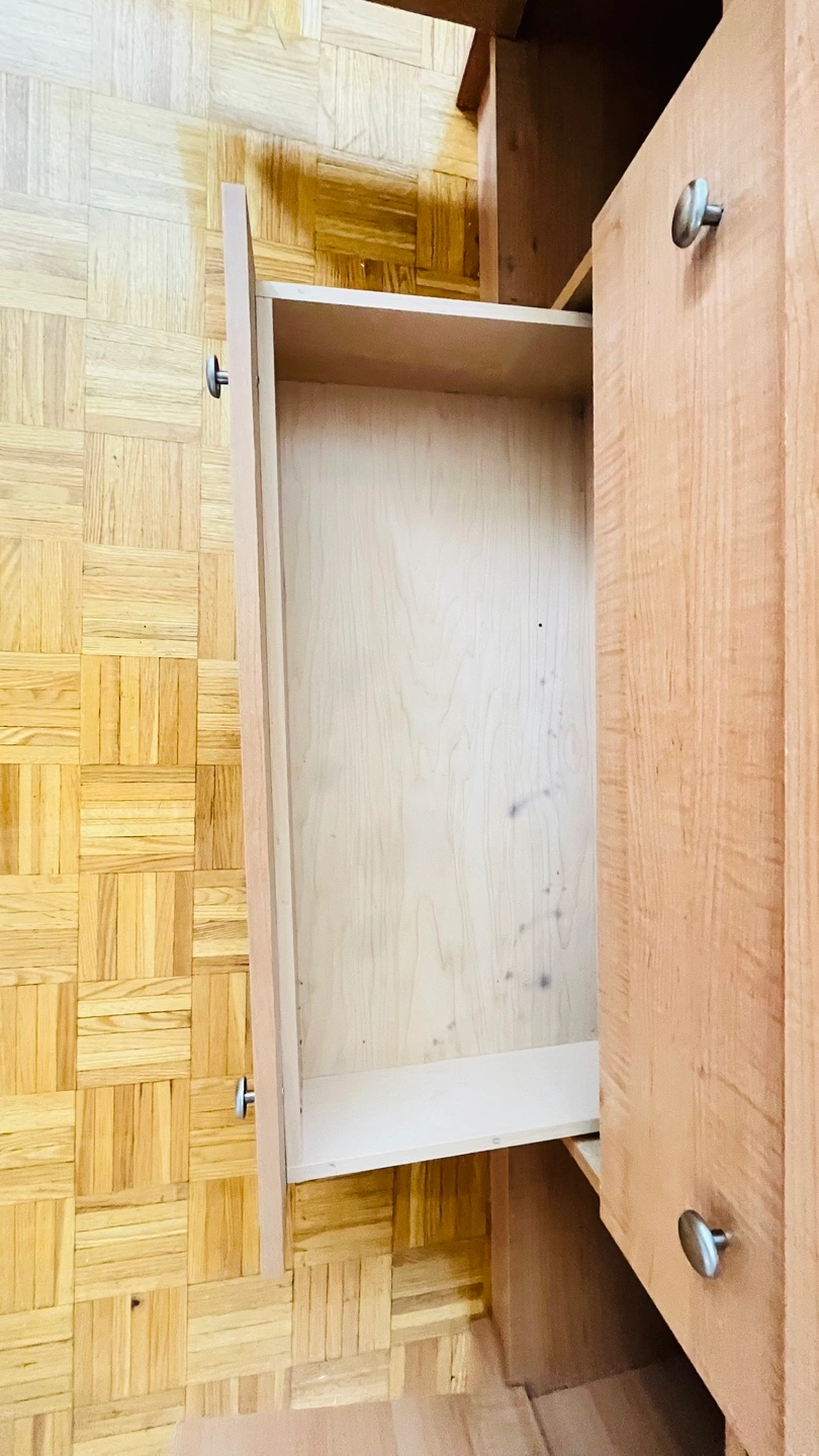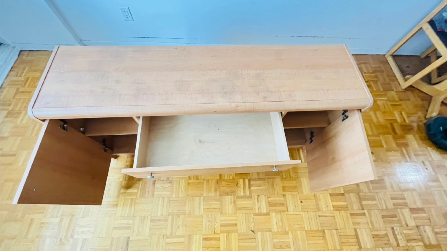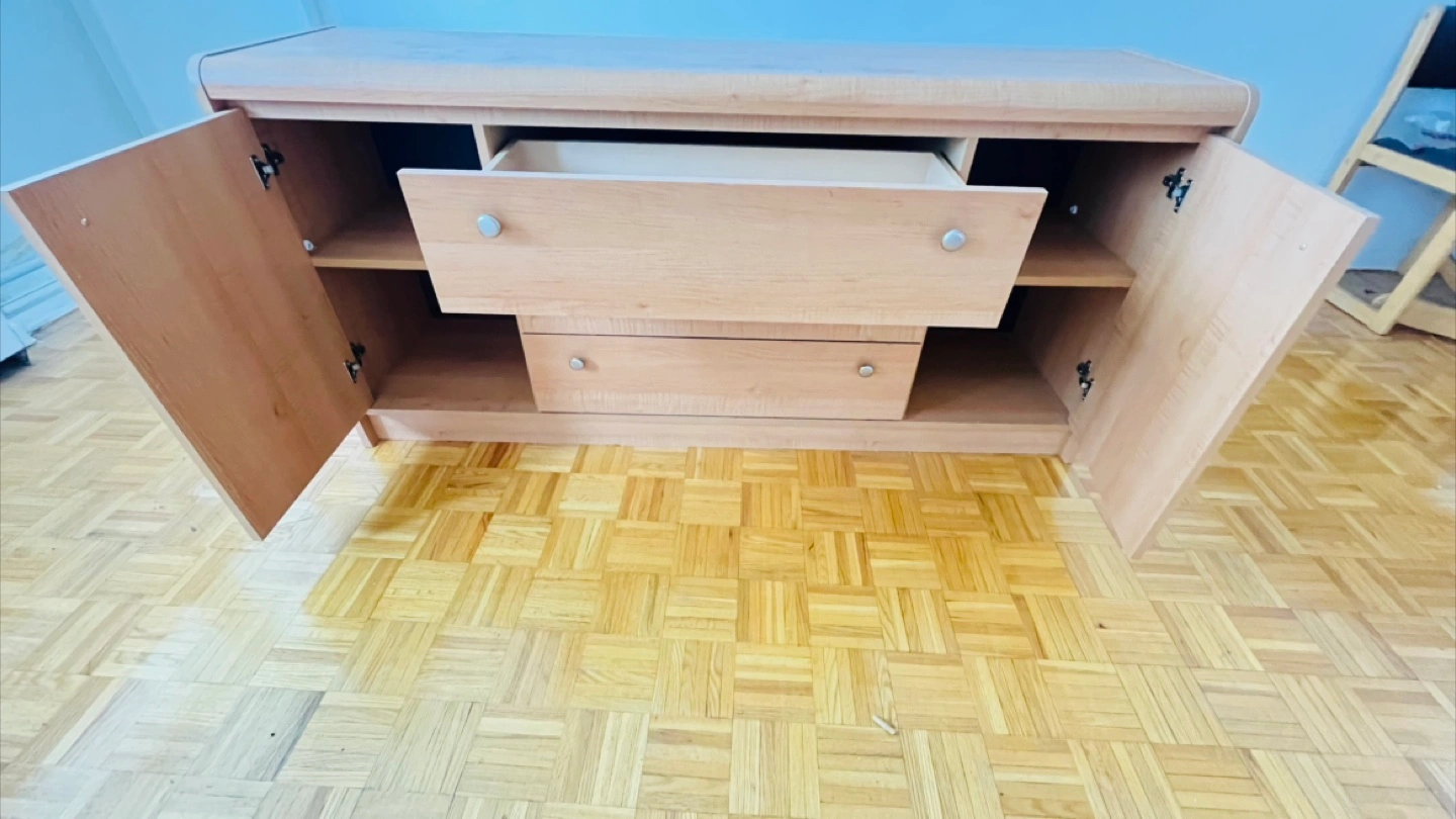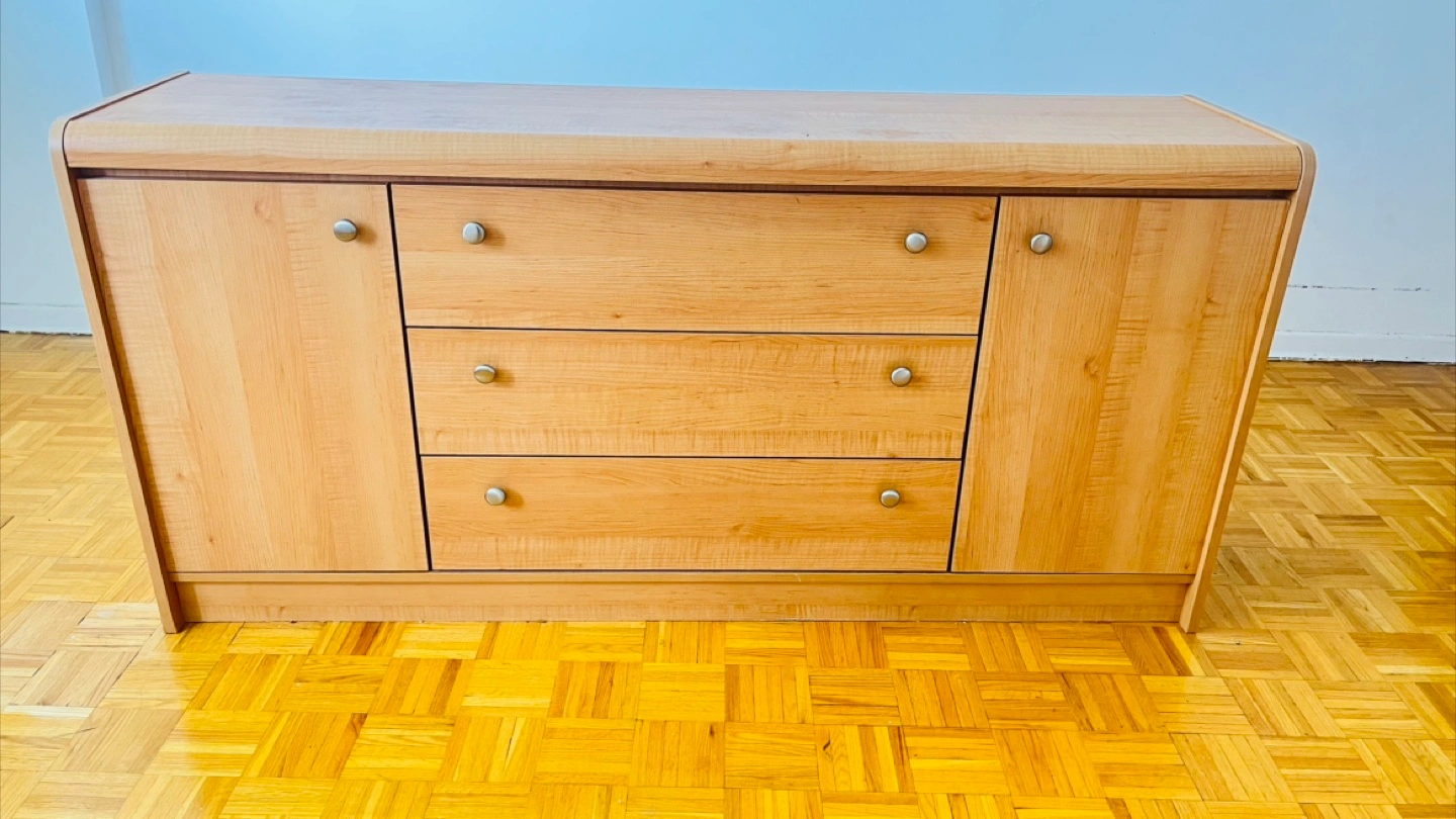 Light wood cabinet. Features doors and drawers. Metal hardware. Rounded edges. Provides ample storage space, which can ease the burden of clutter.
