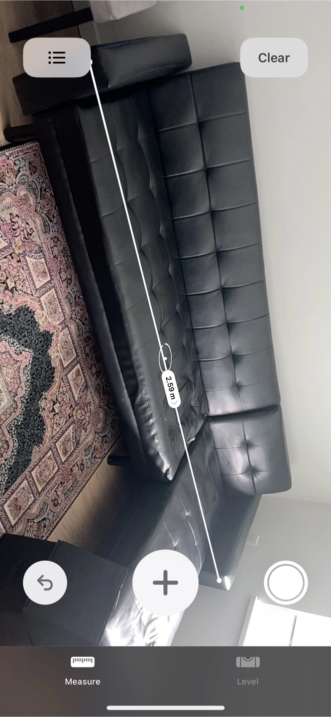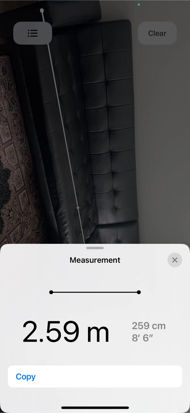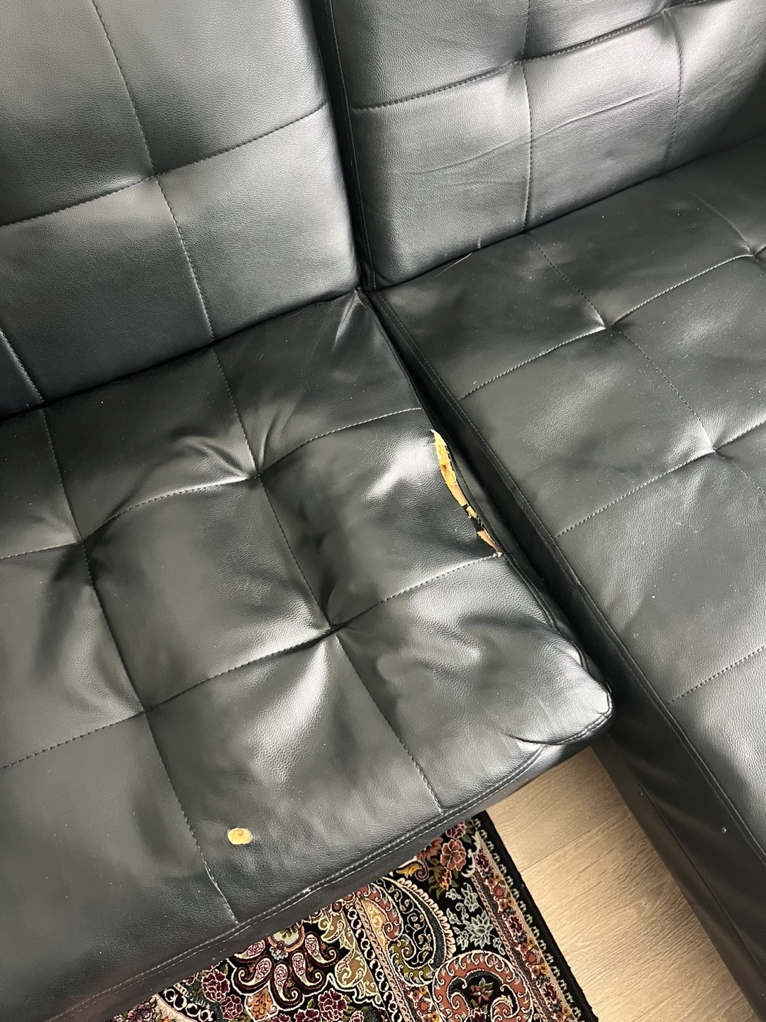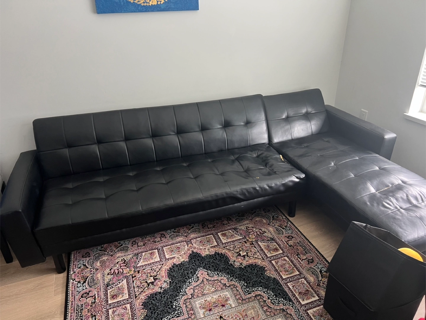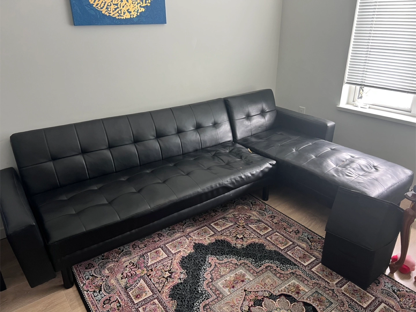 Sectional sofa. Upholstered in black material. Has a chaise lounge. Perfect for relaxing after a long day. Turns into a bed.