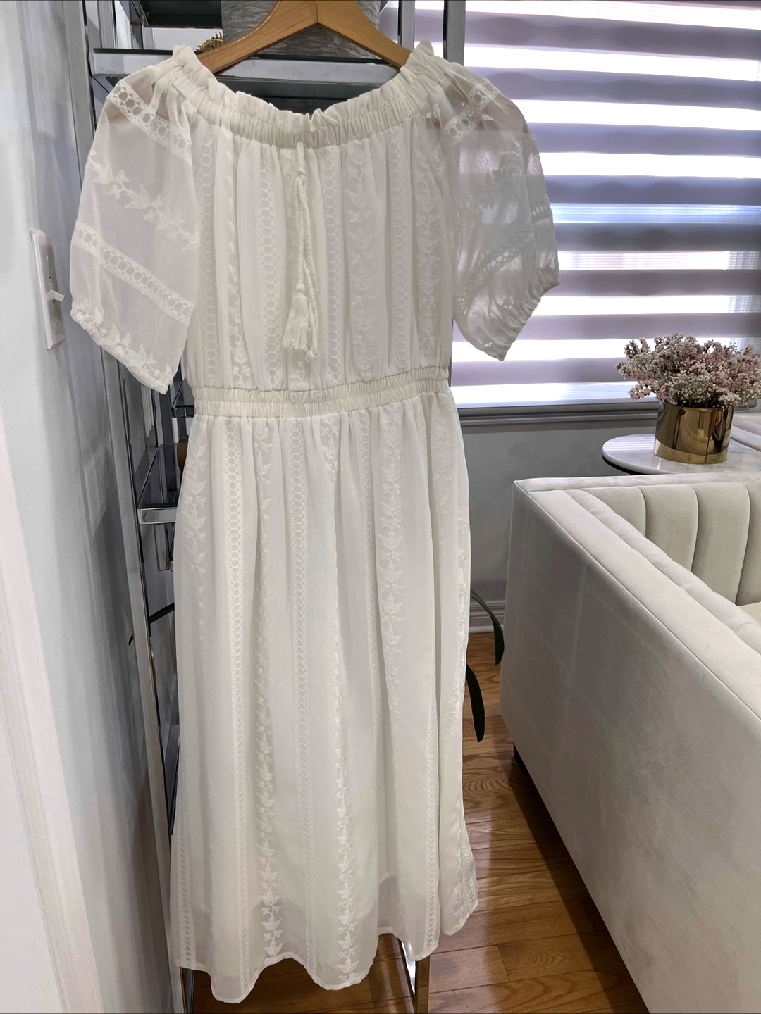 A beautiful white dress. Features an off-the-shoulder design. Dress with subtle embroidery and a drawstring at the chest. Size fits small -medium