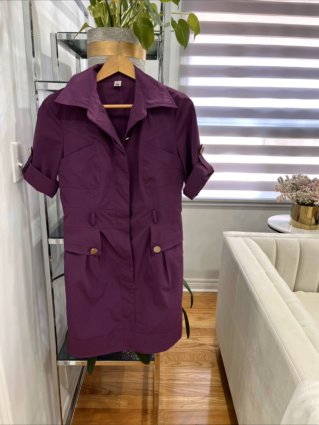 A beautiful purple dress. Collared neckline. Short sleeves with gold buttons. There are front pockets and gold button closures. This is a perfect item to slip into at the end of a long day.