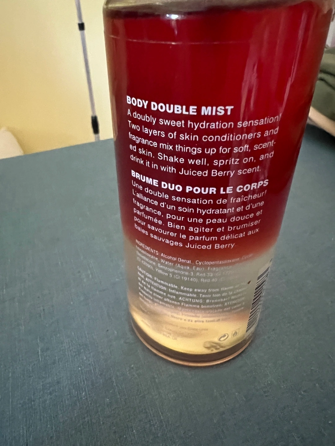 A bottle of body mist, great for a subtle fragrance. This body mist smells like berries.
