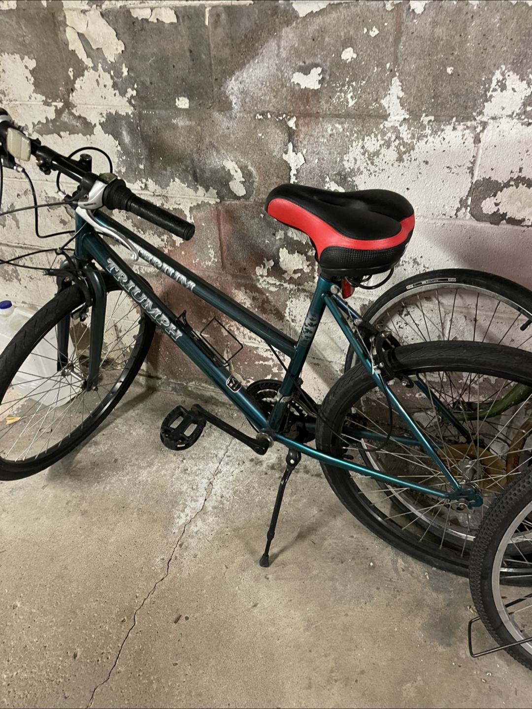 Dark green bicycle, with a black and red seat. Handlebars are black, as are the pedals. Cycling through the city offers a nice and relaxed experience.