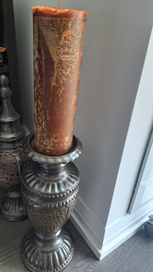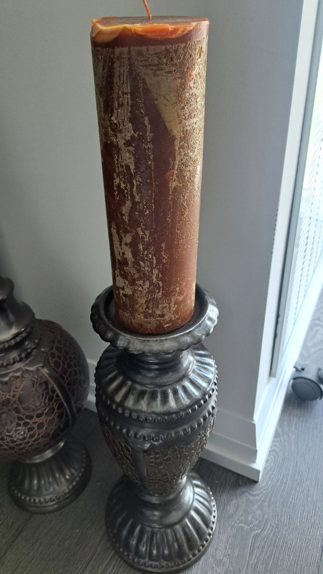Tall candle holder with a brown candle on top. The holder has an ornate design and sits on a base. Perfect for a relaxing evening atmosphere. Bombay brand.