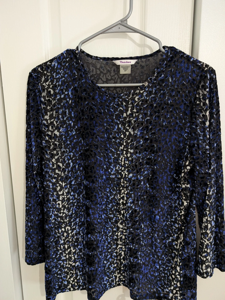 213A great long-sleeved top. Features a beautiful blue pattern. Would be a nice addition to any wardrobe.