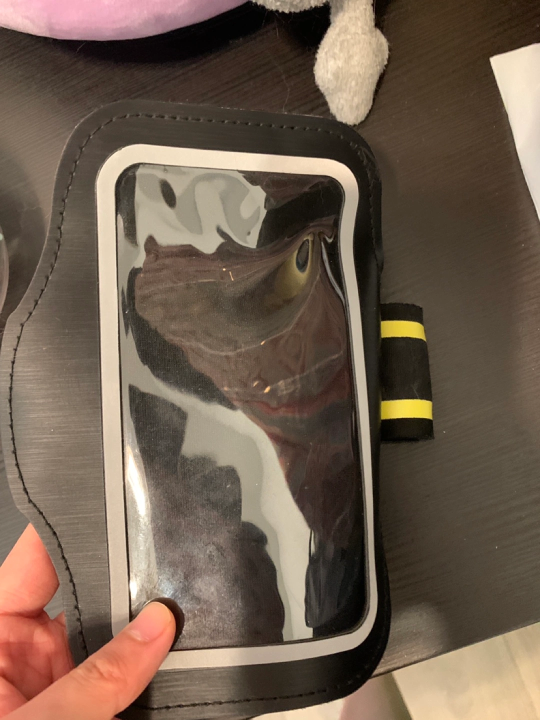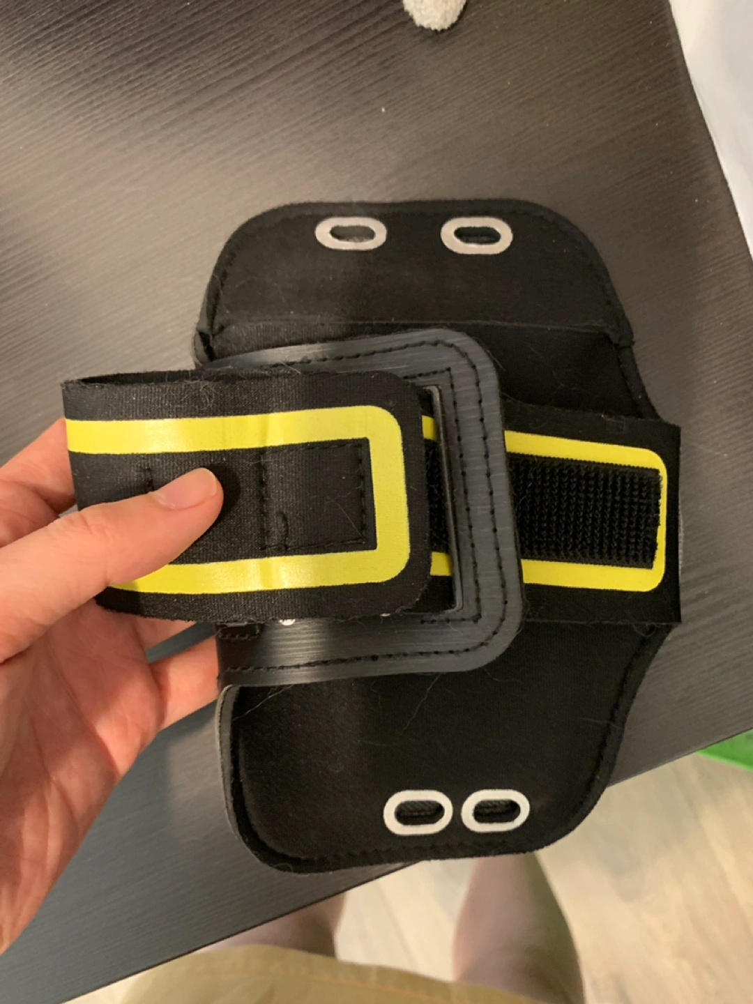 The item is a black arm phone holder. It has a clear front for viewing the phone. It has yellow accents, and velcro straps. Use this arm phone holder to take your mind off of any worries while you work out.