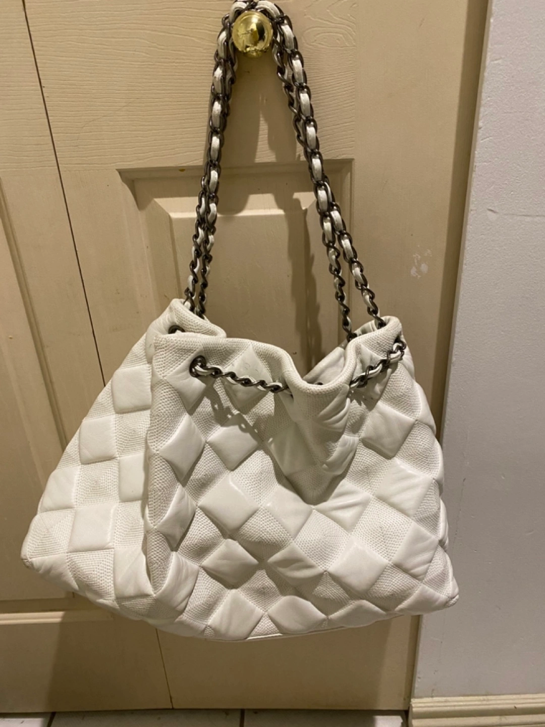 A white handbag. The purse has a diamond quilted pattern. Features chain straps. Perfect for carrying everything you need in a stylish way.
