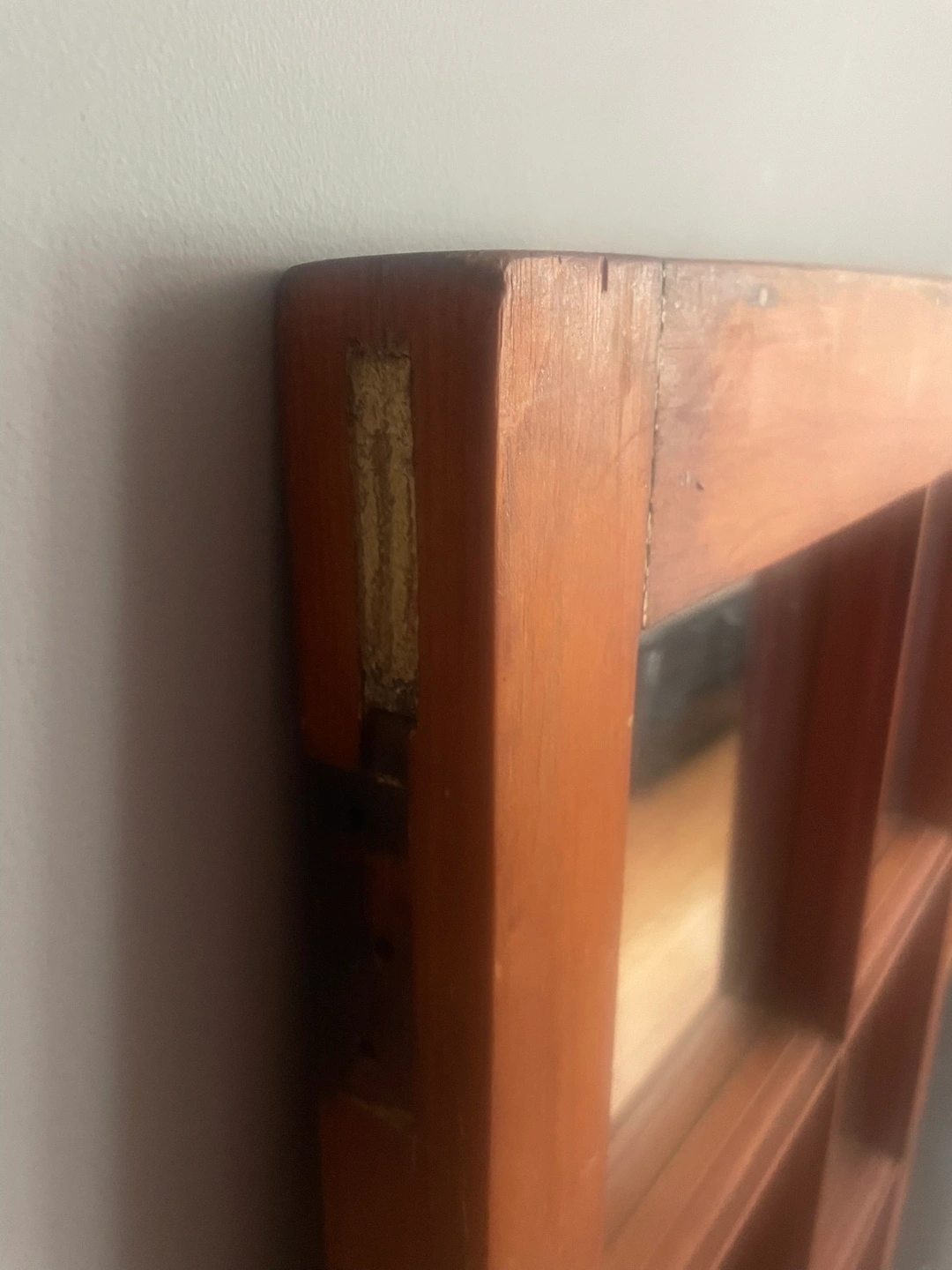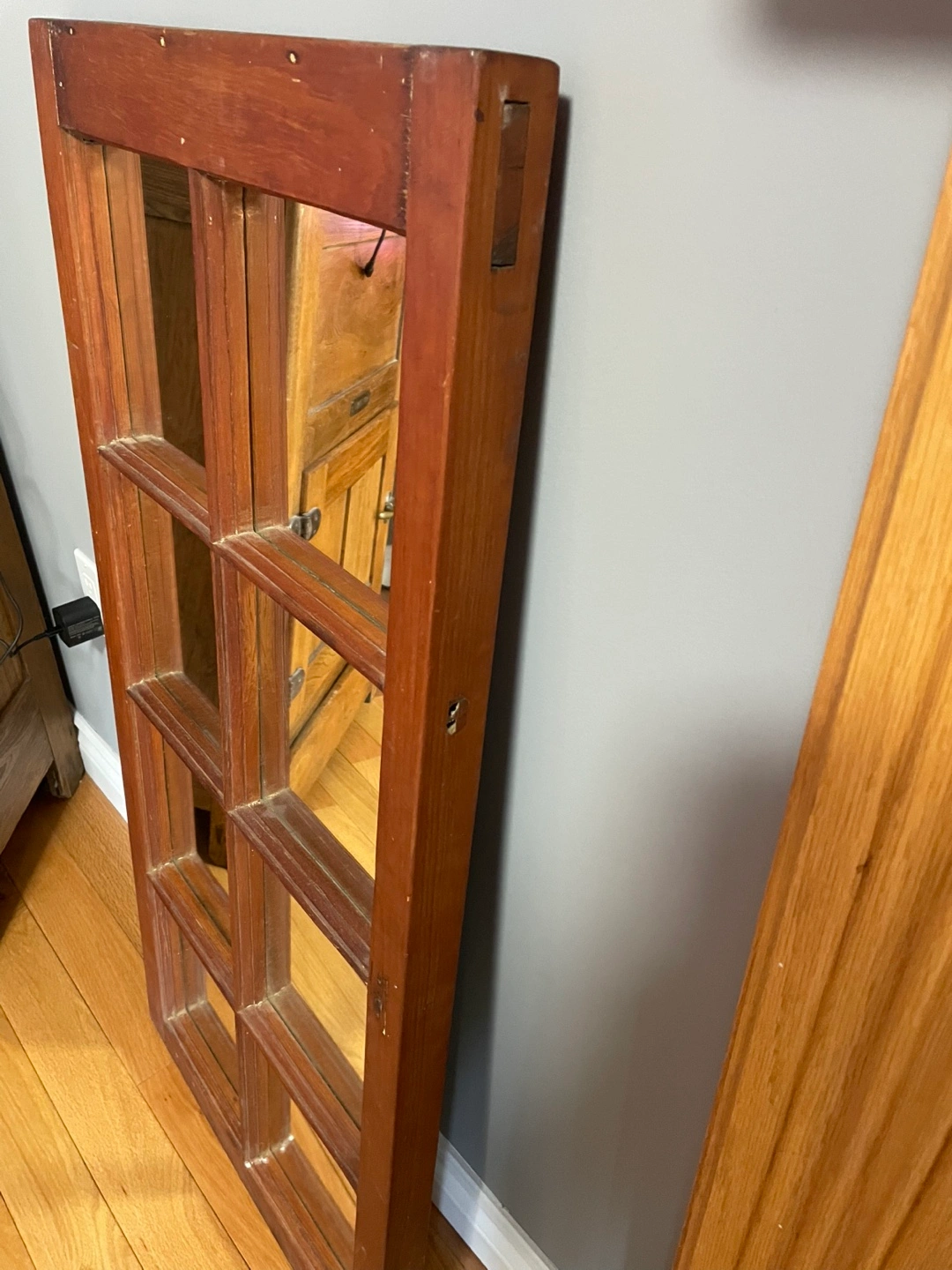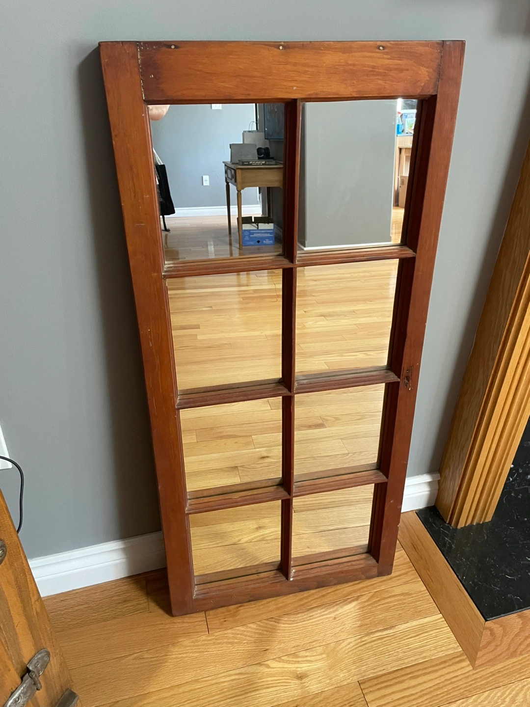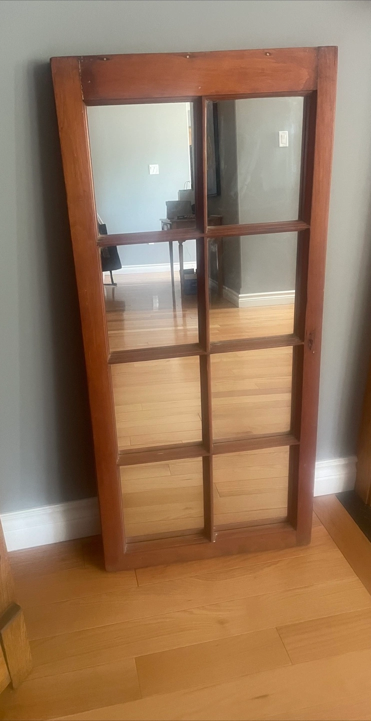 Spruce up your space with this unique antique window frame, repurposed as a mirror! This charming piece features a rustic wooden frame with a multi-pane design, each pane fitted with a mirror to reflect light and add character to any room. Note this is a used item so it will have some imperfections due to age.