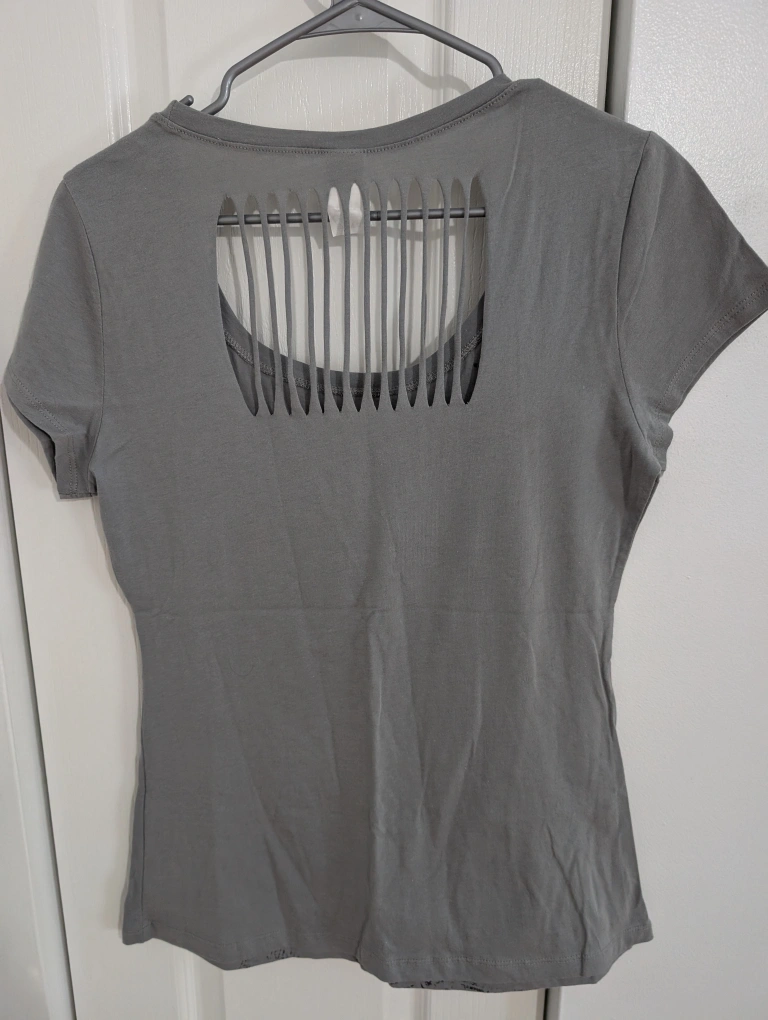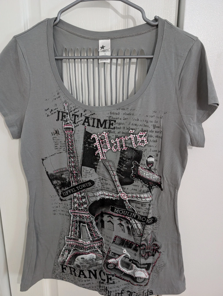 213A grey t-shirt. Short sleeves. Features a cutout back. Embellished with a Paris design on the front. Great for lounging on a lazy afternoon.