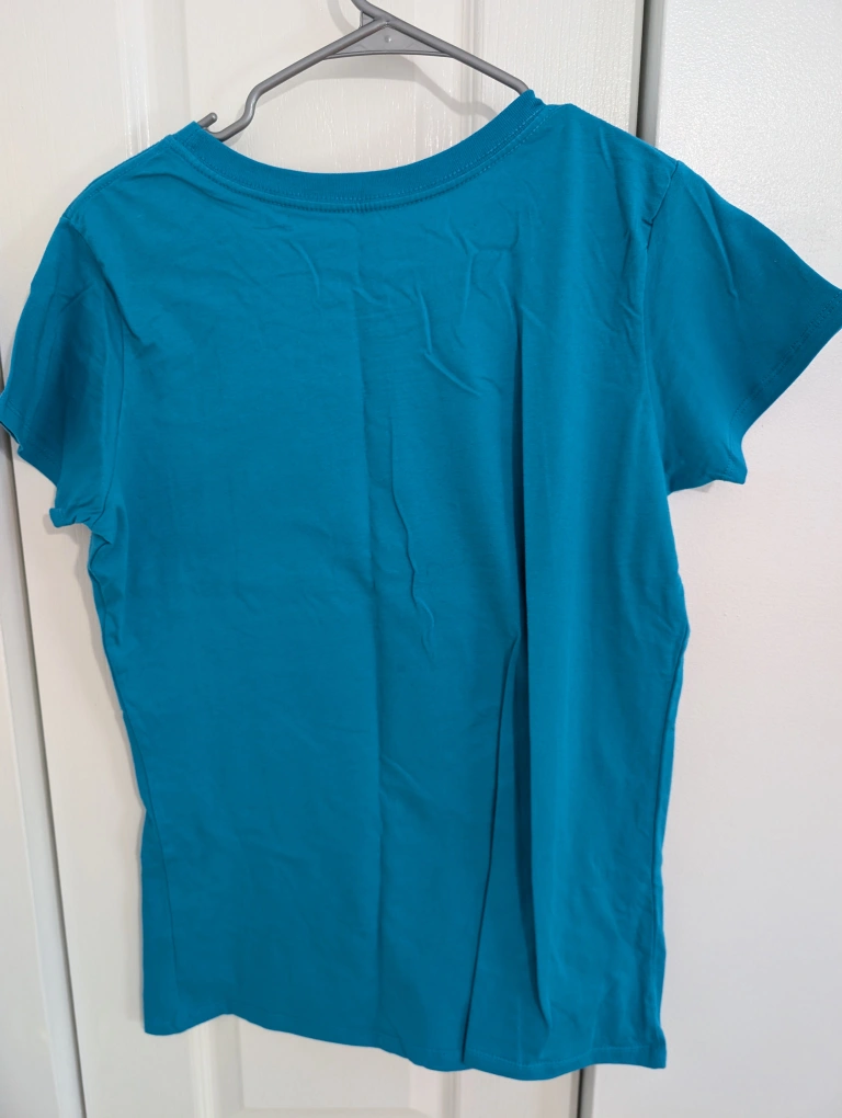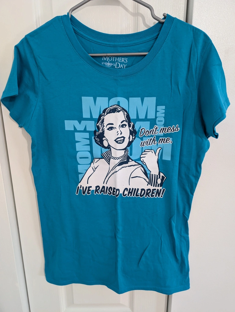 213A turquoise-colored tee with a graphic design. The front features a vintage style image and the words "MOM", "Don't mess with me", and "I've raised children!". The back is plain. It's perfect for those casual days where you want to feel comfy.