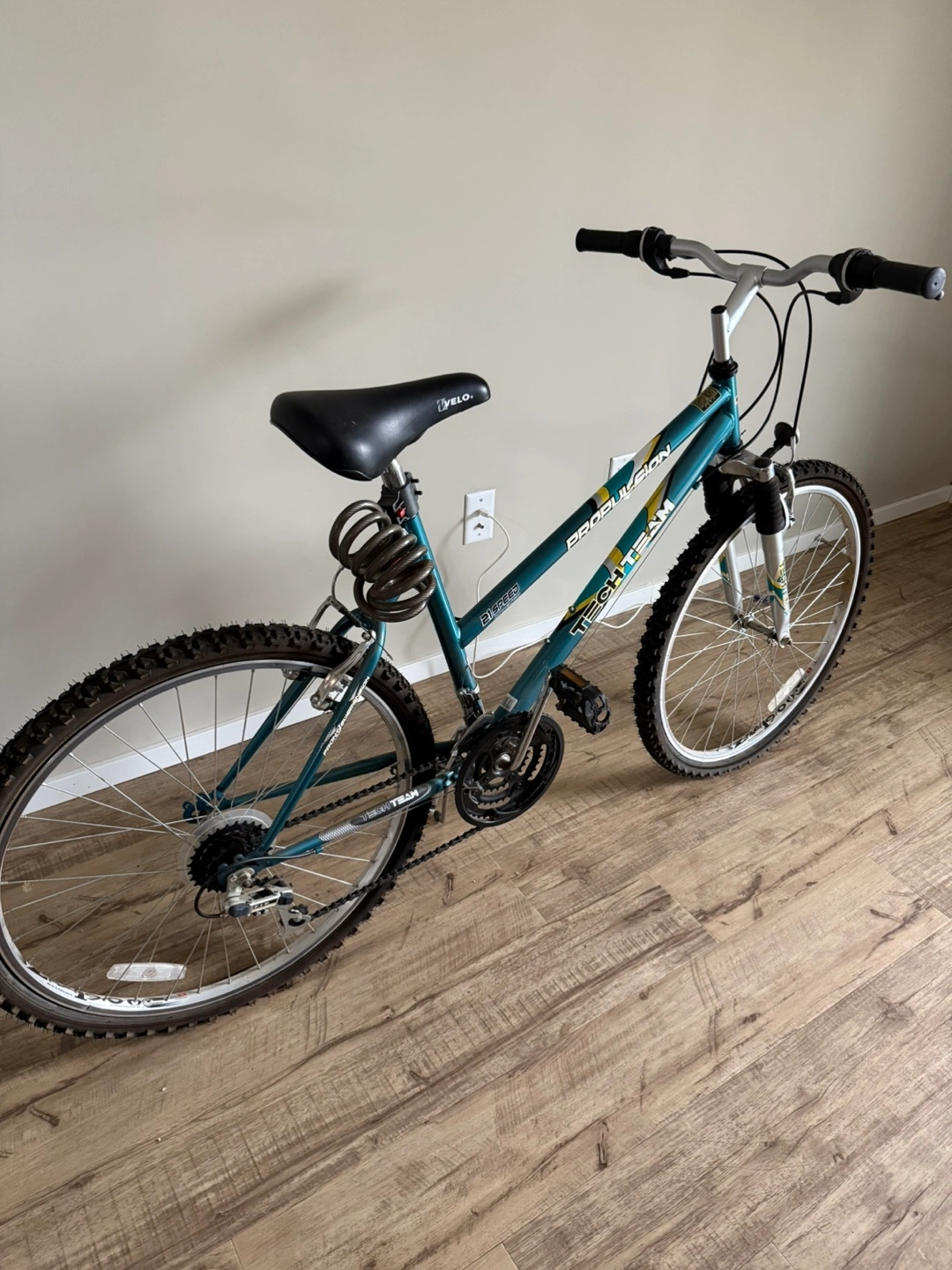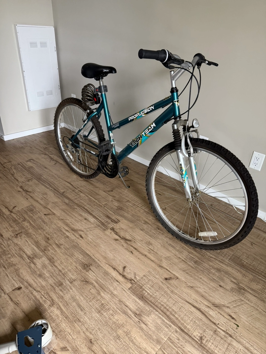 The bike frame is a teal colour. Black seat. Handlebars are black with silver accents. Tires are dark with tread. It comes with a lock for your peace of mind. You can use it to go on scenic rides to clear your mind. Tires need air. Price includes an excellent anti-theft lock. Price is firm.