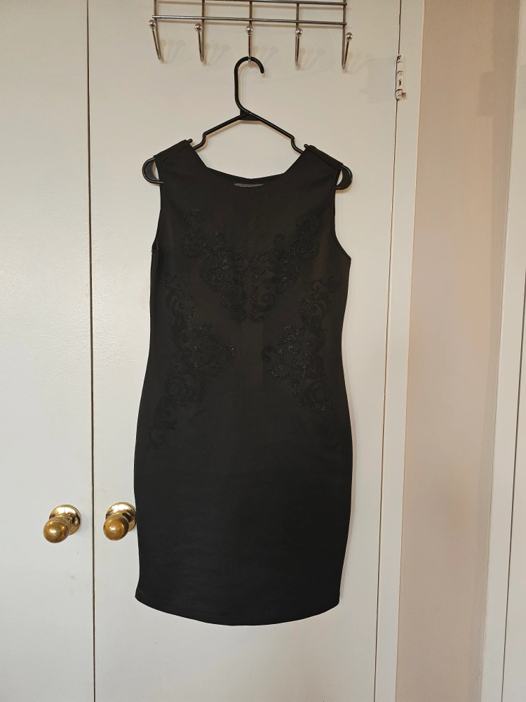 A sleek black dress. Sleeveless. Detailed embroidery on the front. Perfect for a night out. The way it drapes is really calming.
