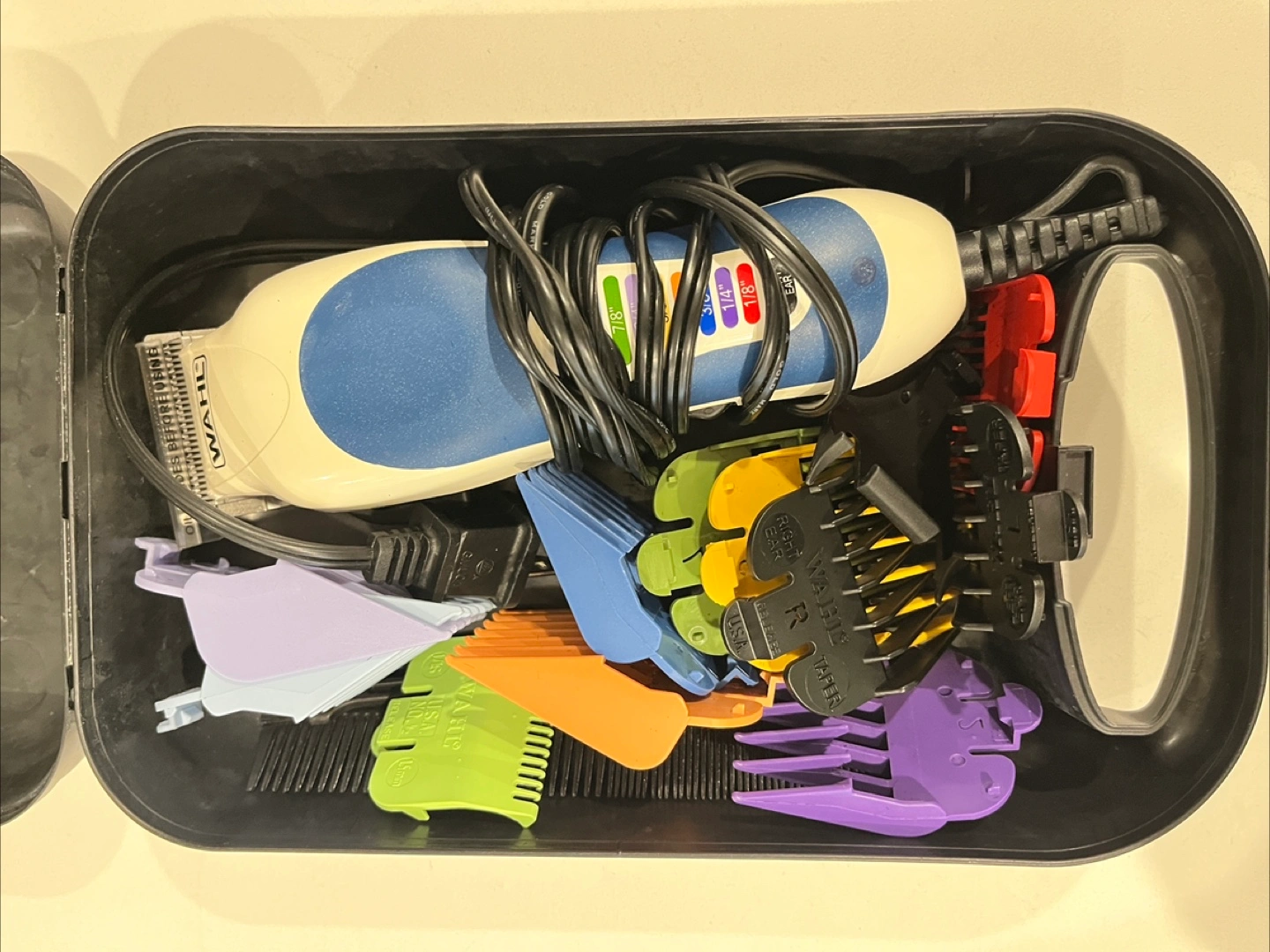 Black case holding an electric hair clipper. Includes many colored guide attachments. The hair clipper has a cord. A great way to have a new look from the comfort of your own home.