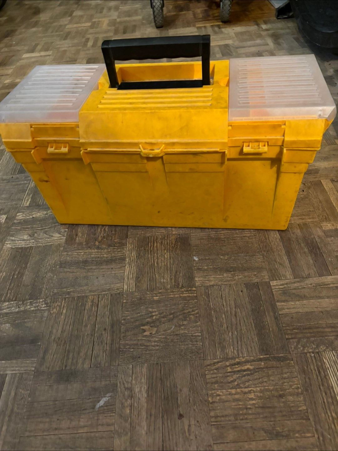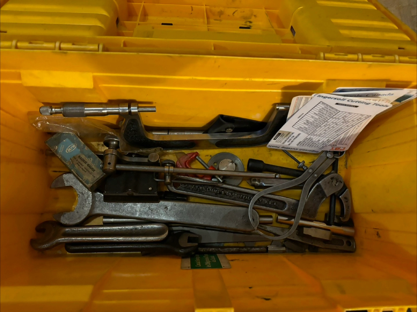 I'm offering this vintage set of tools. There are two measurement tools in a case. Also, there are some wrenches, a yellow toolbox, and some other tools. These tools can make any day more relaxing.