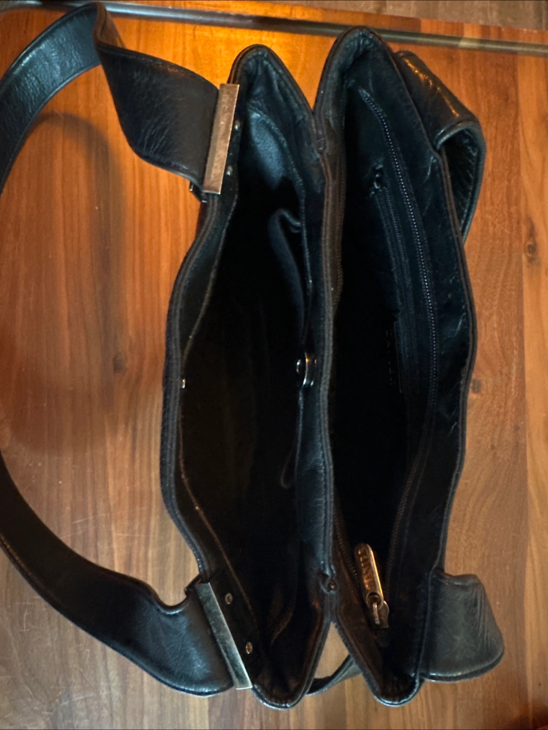 Vintage black leather Danier purse with metal accents.