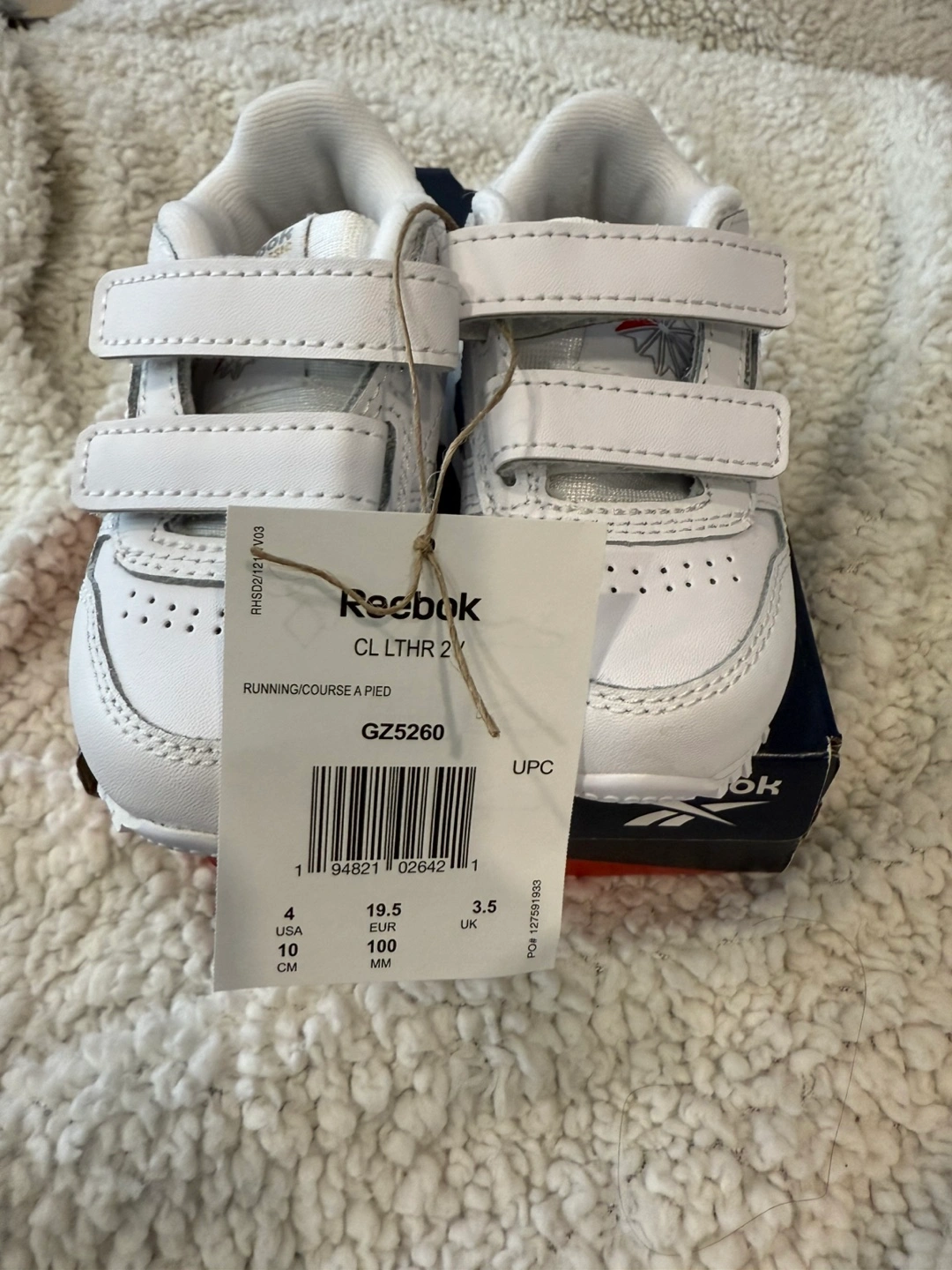 New Reebok white baby shoes. Features velcro straps and a cushioned interior. The shoes come with a box. These shoes could be a lovely gift for someone special. Cash and pick up.
