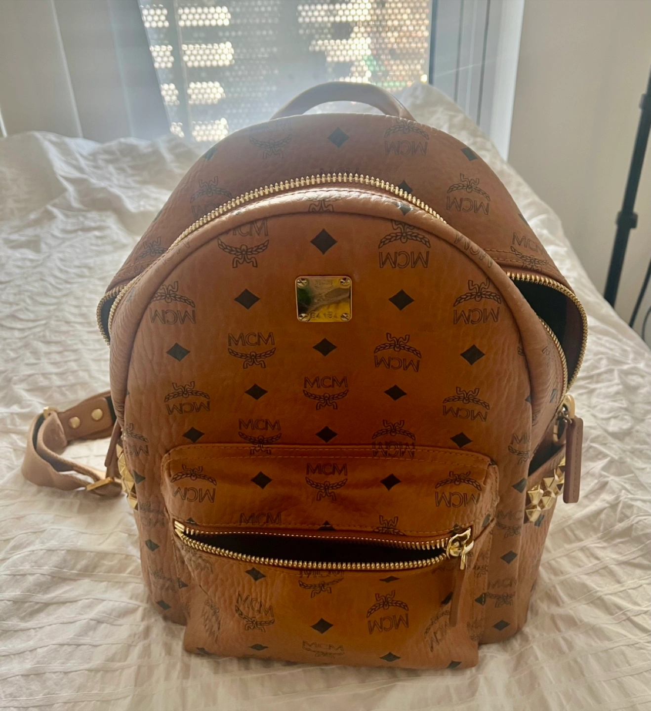 Brown backpack with gold-tone hardware accents. Main compartment features a zip closure. Adjustable shoulder straps included. A great accessory to accompany you on your next adventure.