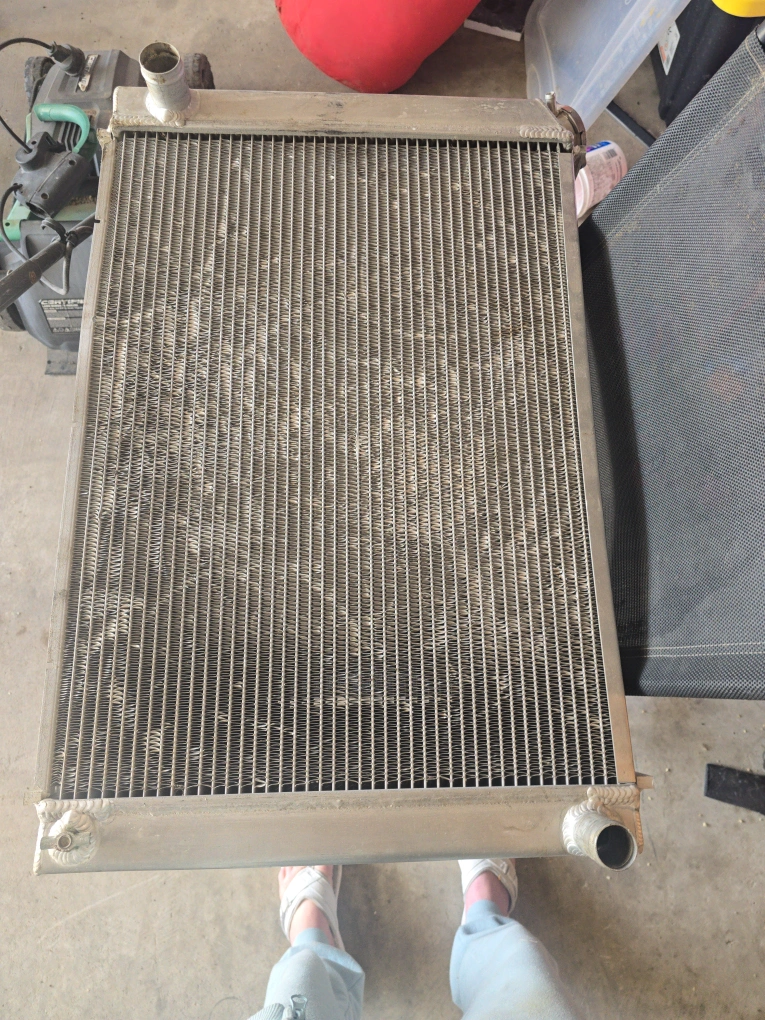 Silver aluminum radiator. for a ford mustang. Rectangular shaped, with what looks like hose fittings. Makes for a great upgrade to keep your engine running smoothly. dimensions are 29 Inches by 19 Inches by 2.5 inches.