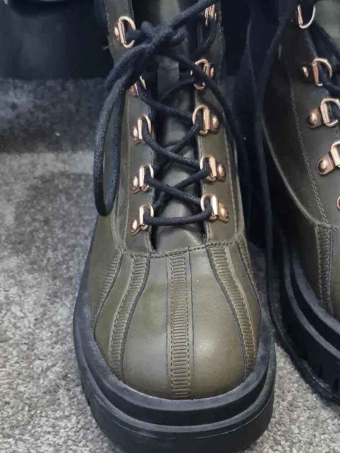 These lace-up ankle boots feature an olive green upper. The boots have black laces and bronze-coloured eyelets. The soles appear to be black, chunky, and a bit platform. Putting these on before your next walk will bring you much joy.
