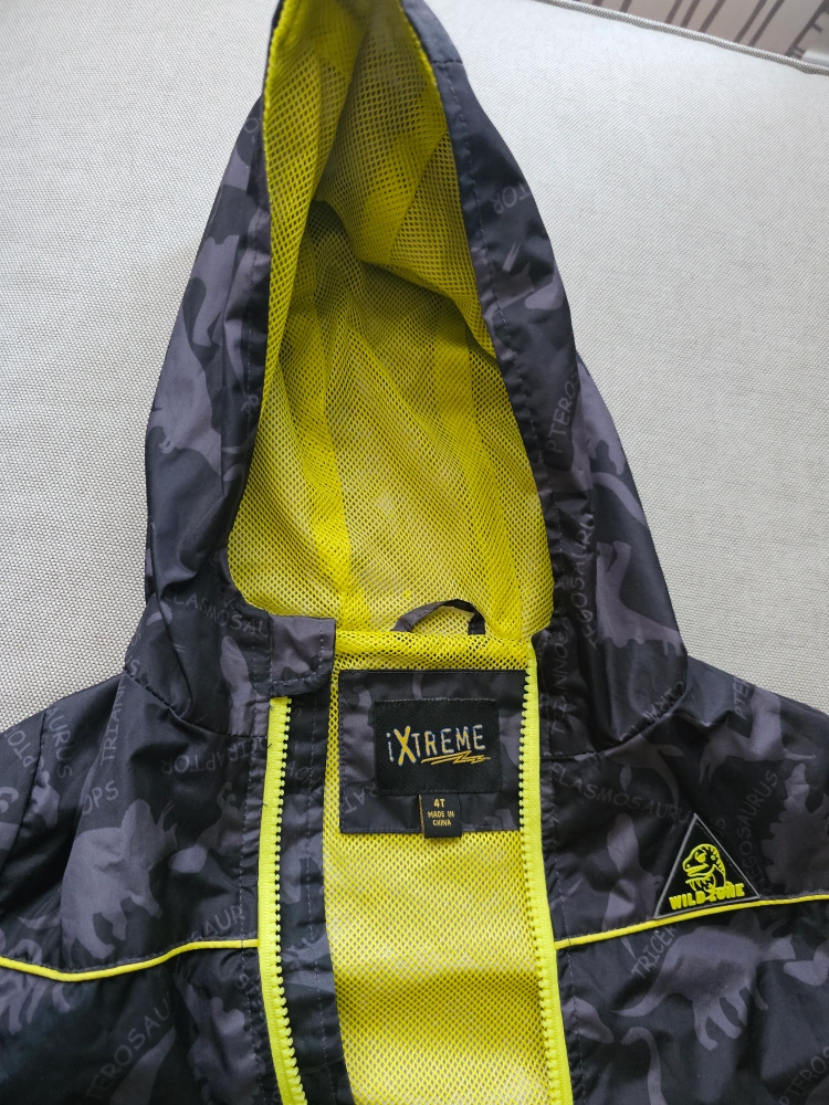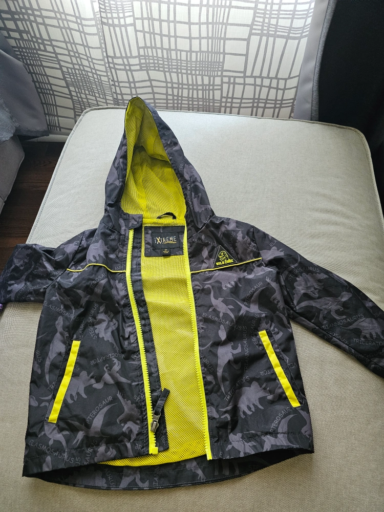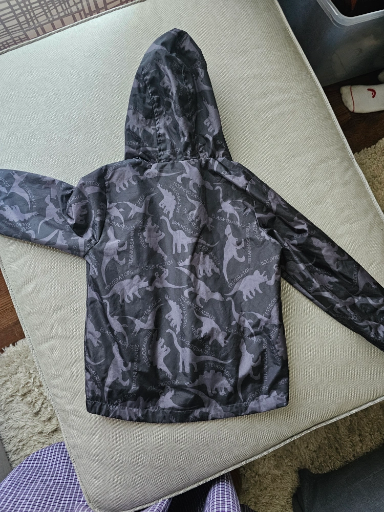Jacket with a dinosaur print. Features a hood and zipper. The inside is yellow. A great option for a walk on a cooler day.