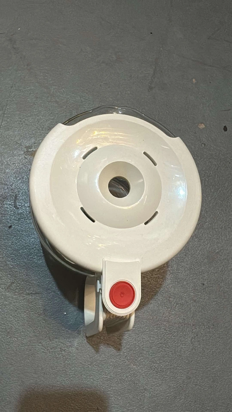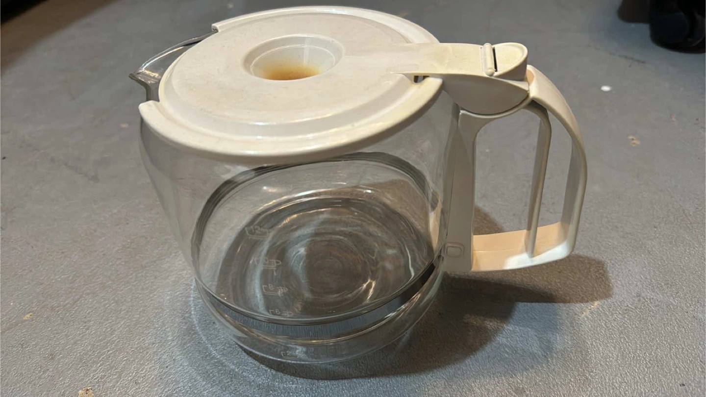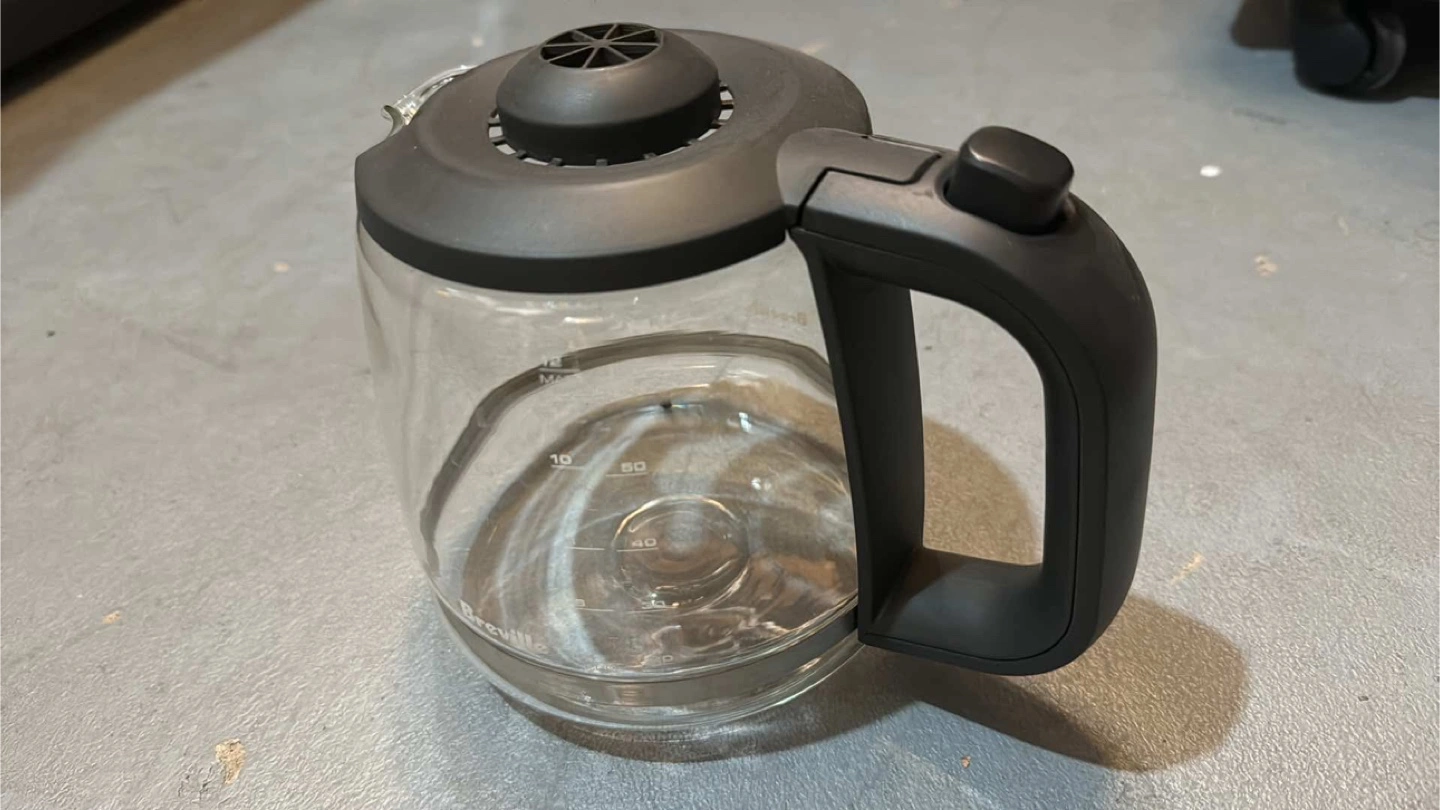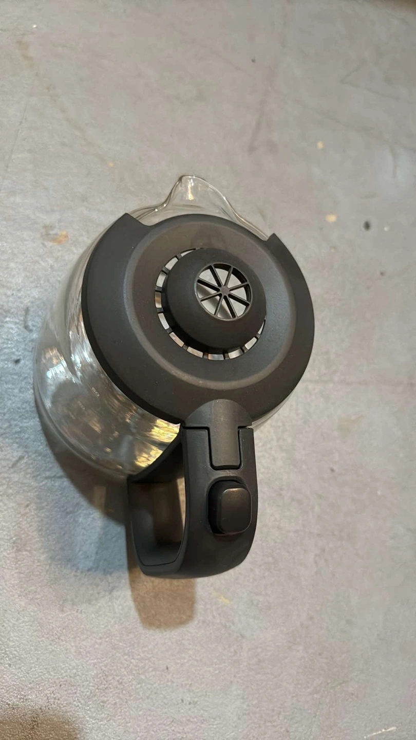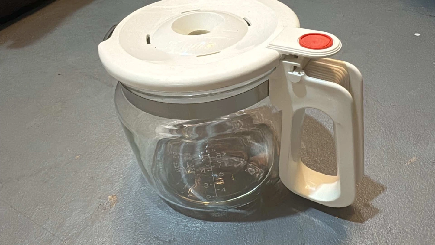 A glass coffee pot with a lid and handle. Features a measuring scale. Comes with a lid. Great for enjoying a cup of coffee.