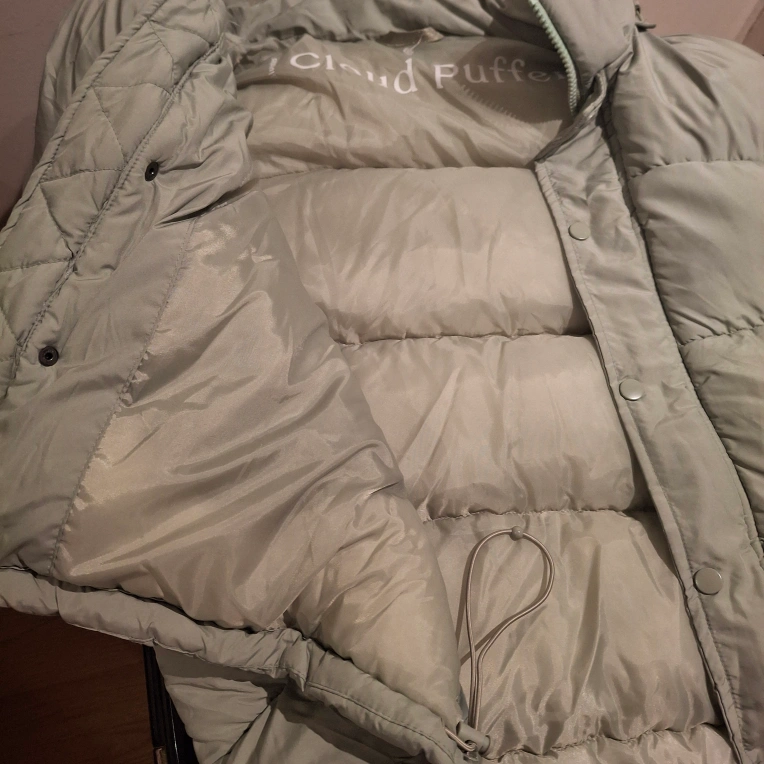 A comfy, light green jacket. A warm choice for cool autumn days. The jacket features a hood and a zip closure. Also, you can find two pockets, and a drawstring at the waist.