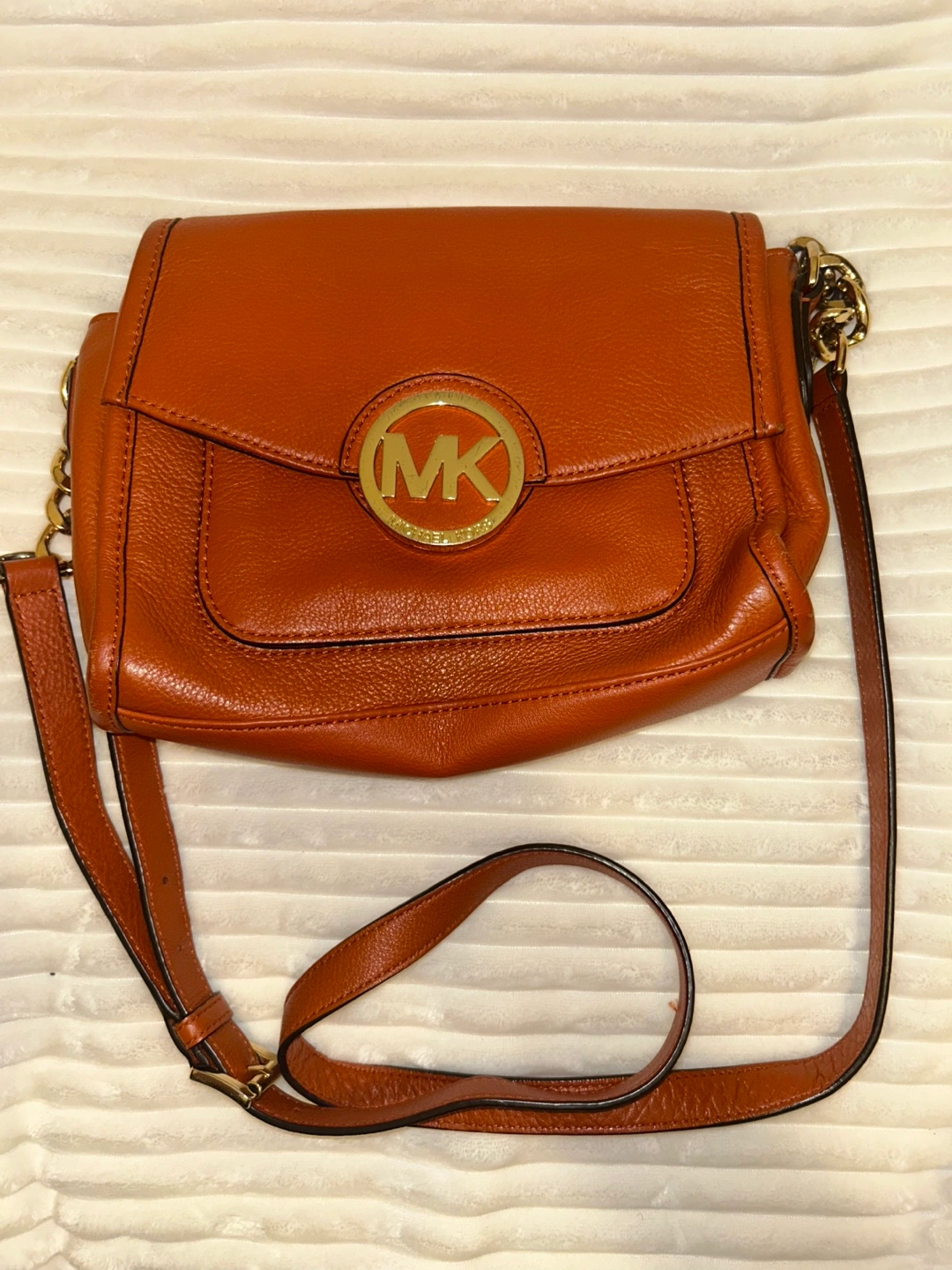 A gorgeous shoulder bag, it is a beautiful shade of orange. Gold-tone hardware. A large flap with a circular clasp. You can find all sorts of essentials inside to keep organized.
