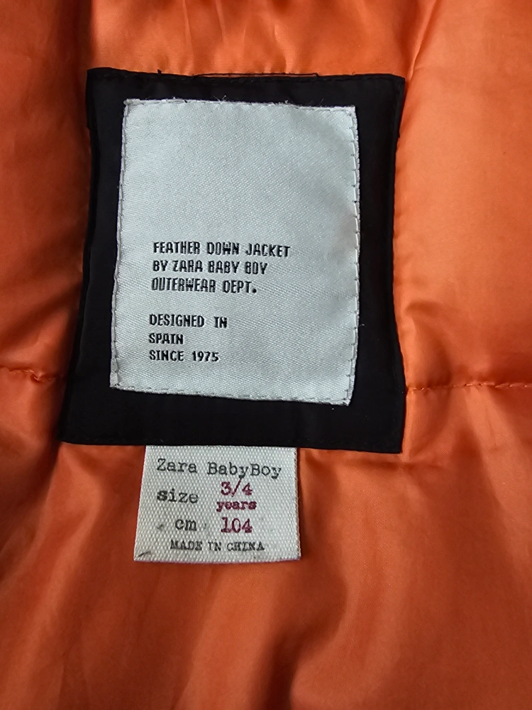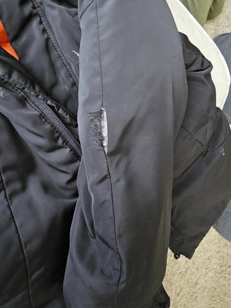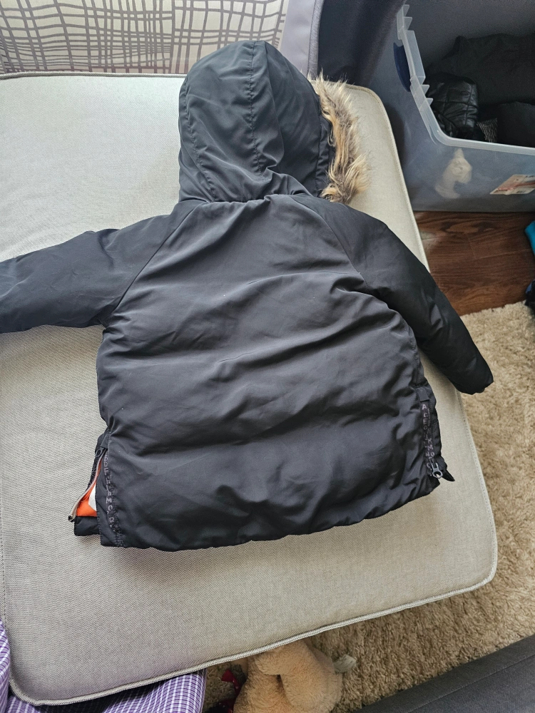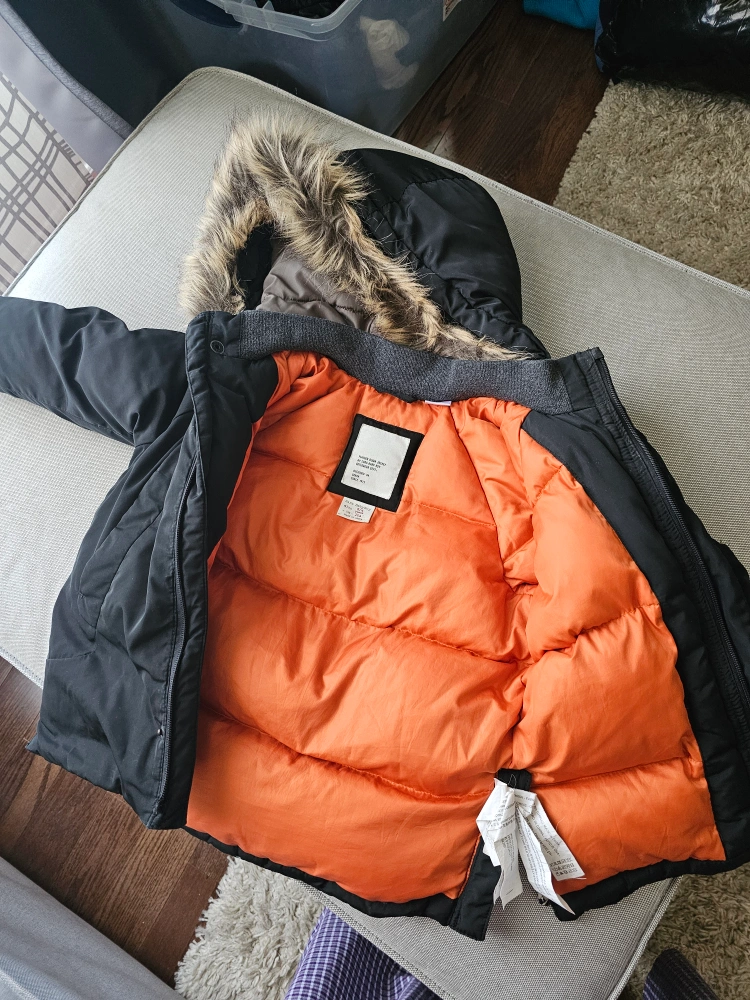 A black jacket with an orange interior. It has a hood with faux fur trim. A zipper closure and pockets are visible. A small rip in the sleeve is visible. A great jacket for a cool day at the park. A little defect at the sleeve. can be fixed at home easily. is not that visible when worn tho.