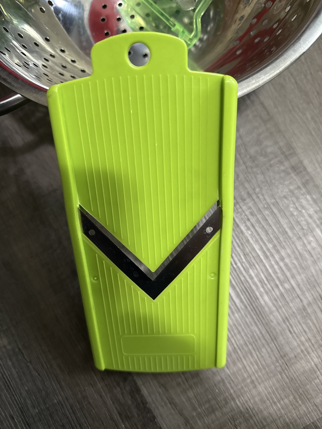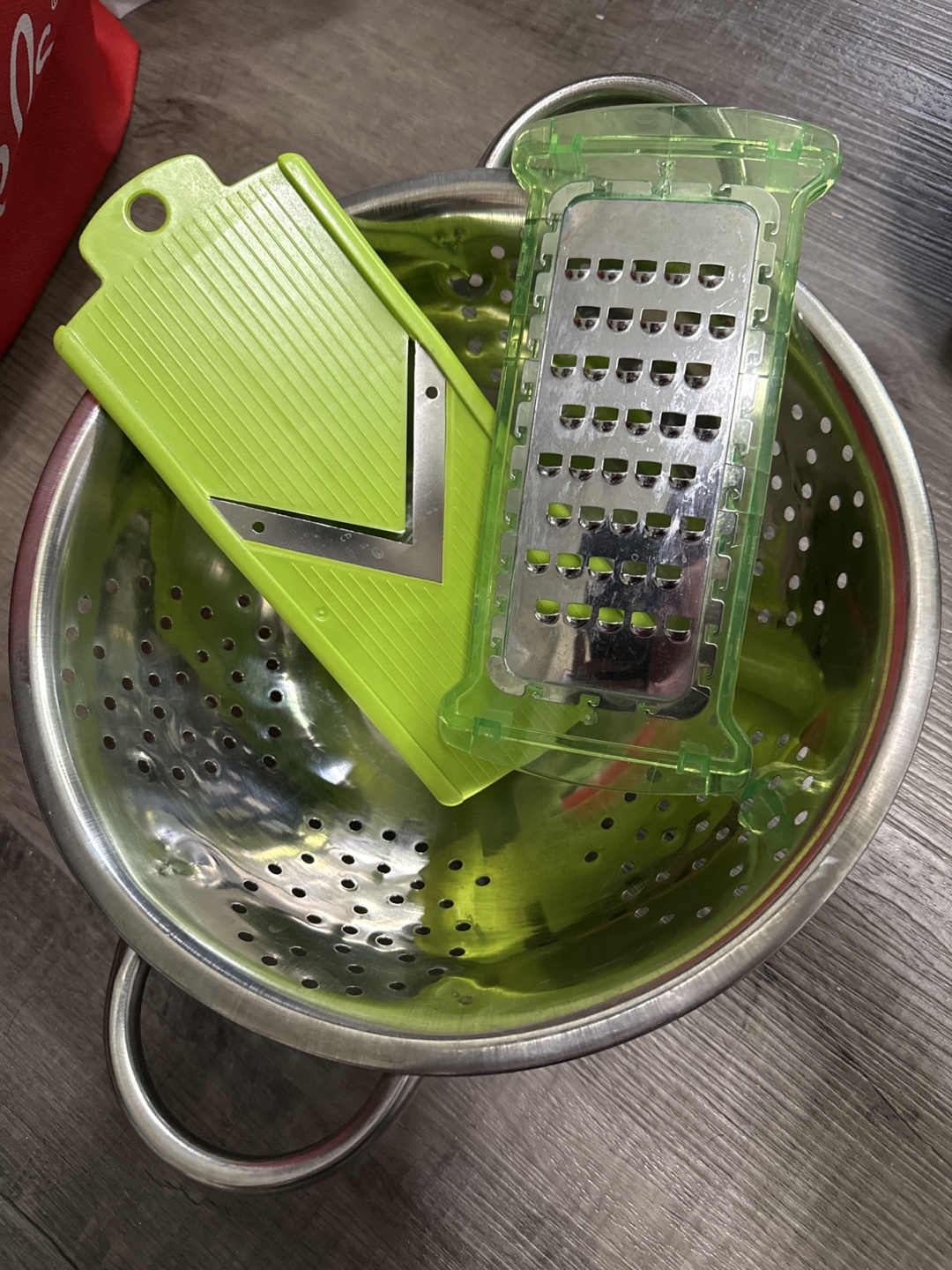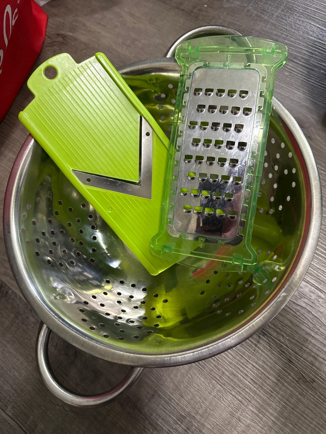 Here is a kitchen prep set. The set contains a stainless steel colander, a grater with a clear green frame, and a green slicer. The set also includes multiple blades for different food preparations. A calm way to spend a quiet afternoon.