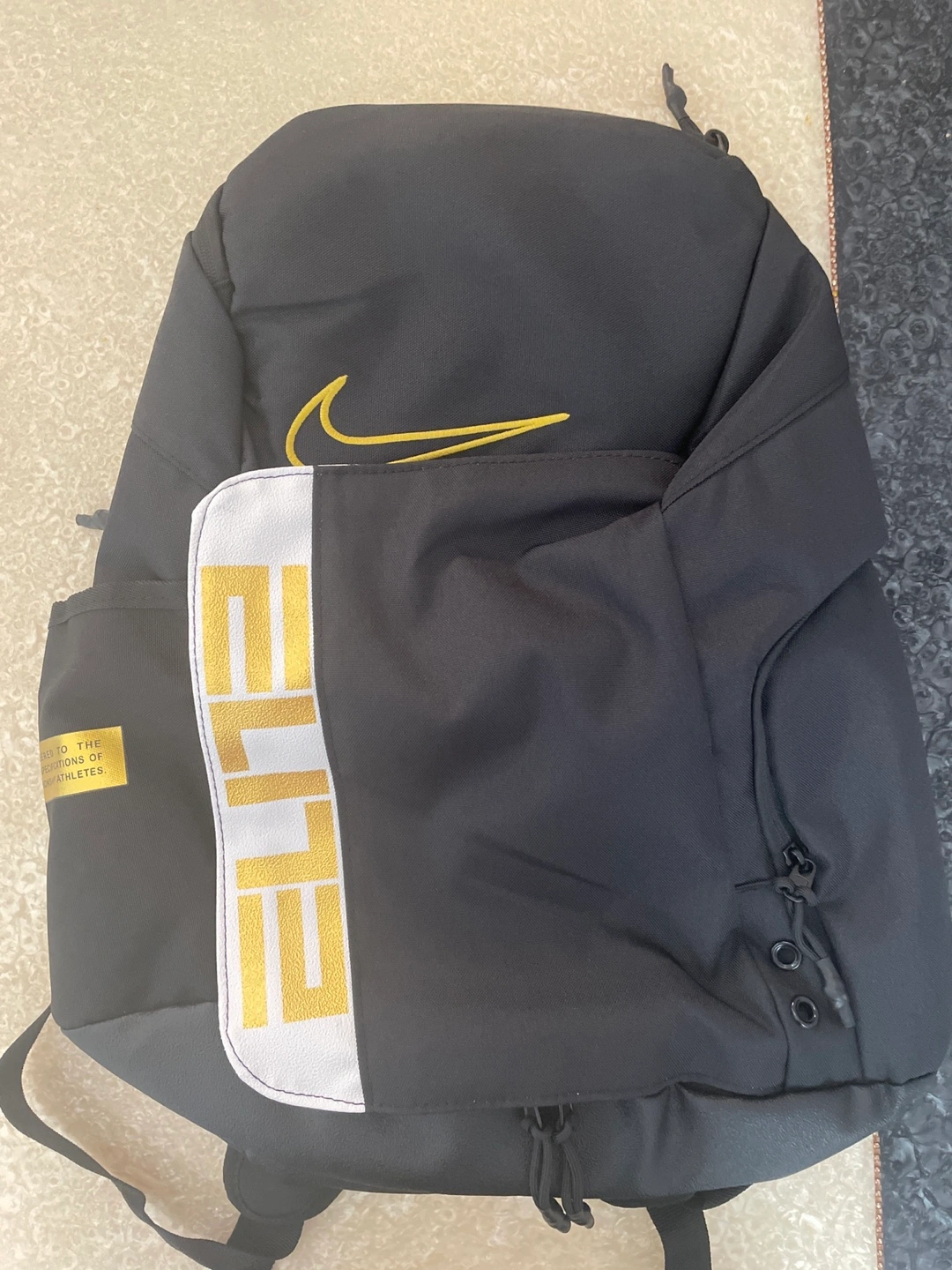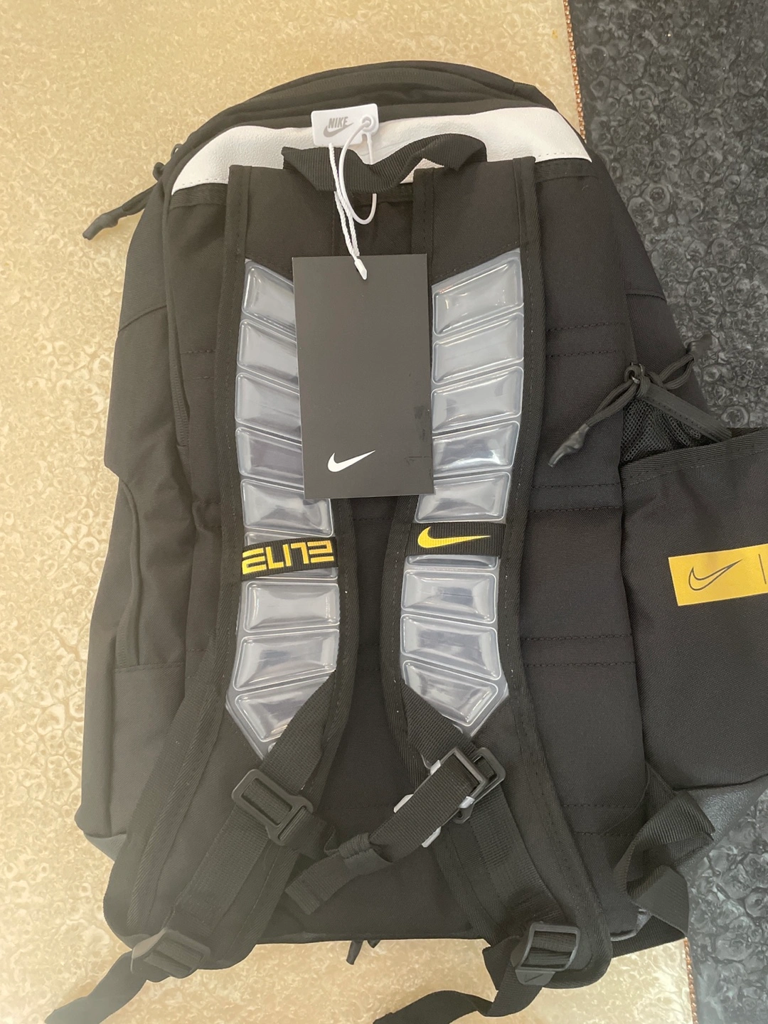 Black backpack. Features a yellow Nike swoosh. "Elite" branding on the front. Multiple pockets, including side pockets and it has a total of four big pockets. The backpack has adjustable straps and is designed for comfort, making it an excellent companion for sports and adventures.