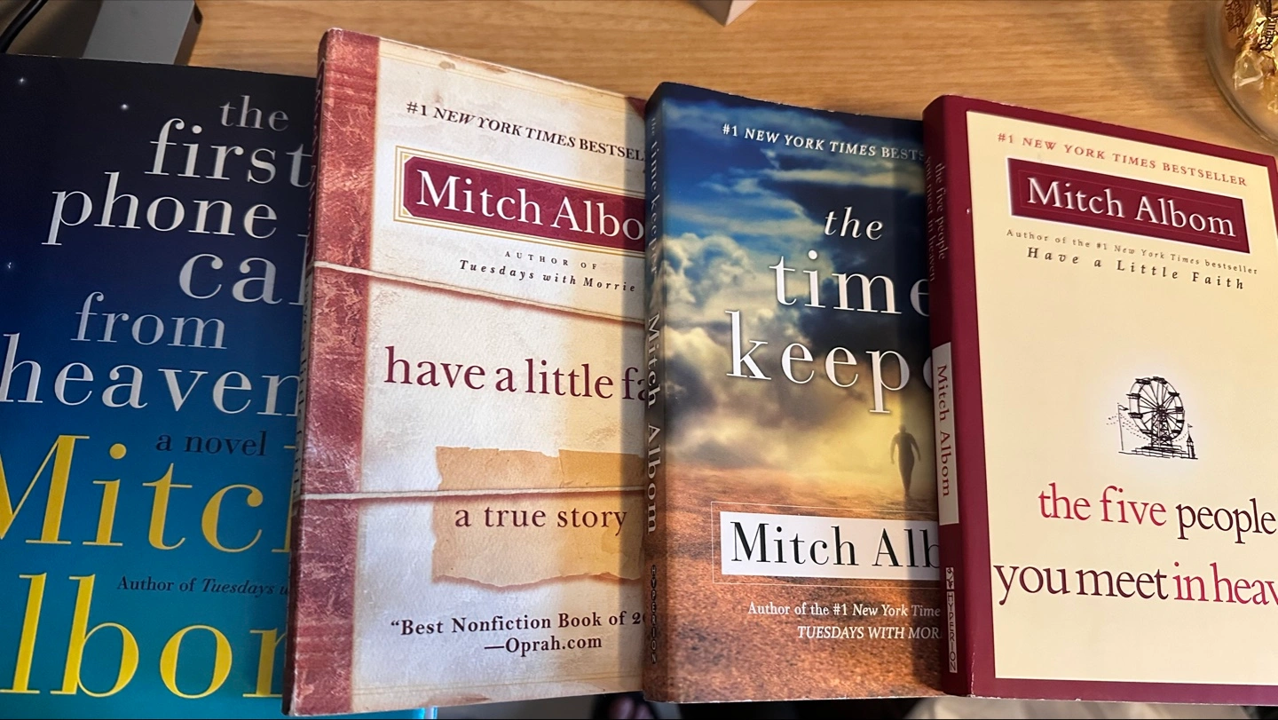 $5/book A collection of four books by Mitch Albom. Books include: *The First Phone Call From Heaven*, *Have a Little Faith*, *The Time Keeper*, and *The Five People You Meet in Heaven*. Reading can be a very nice way to relax after a long day.