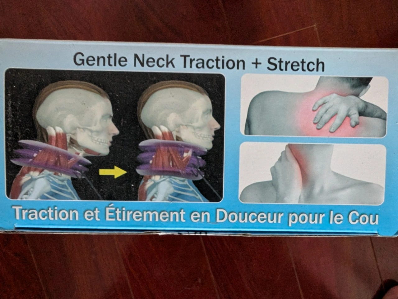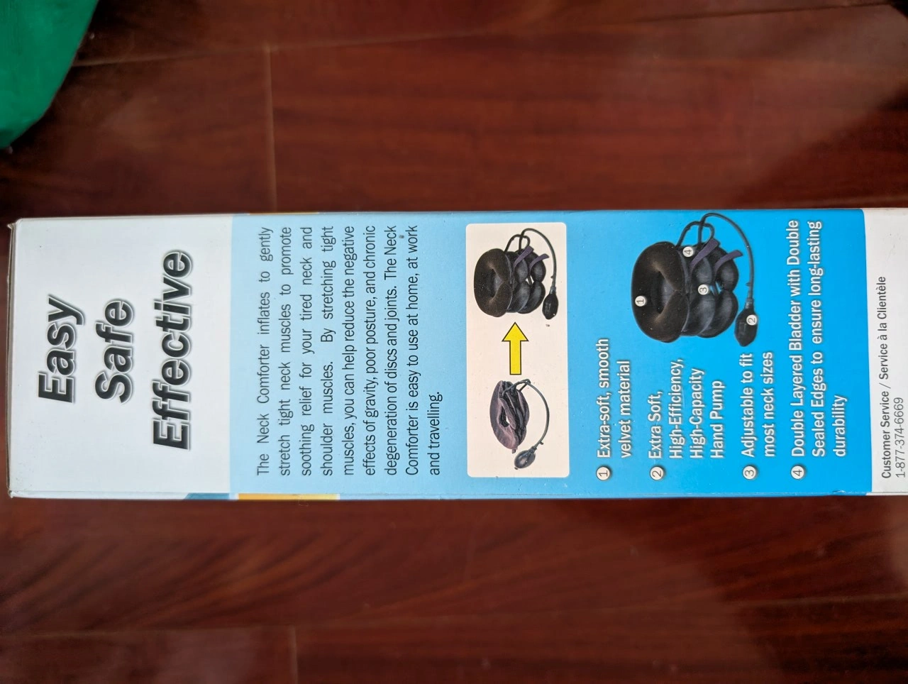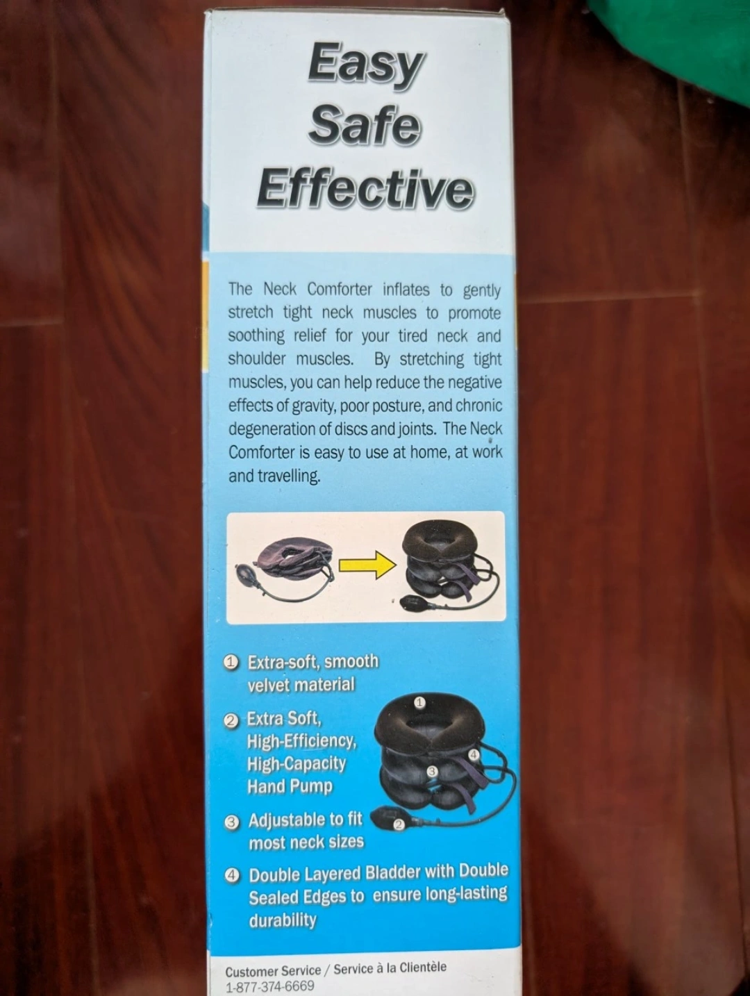 Gentle neck traction with a pump. Designed to stretch the neck. Perfect for home or travel, the item is also very easy to set up.
