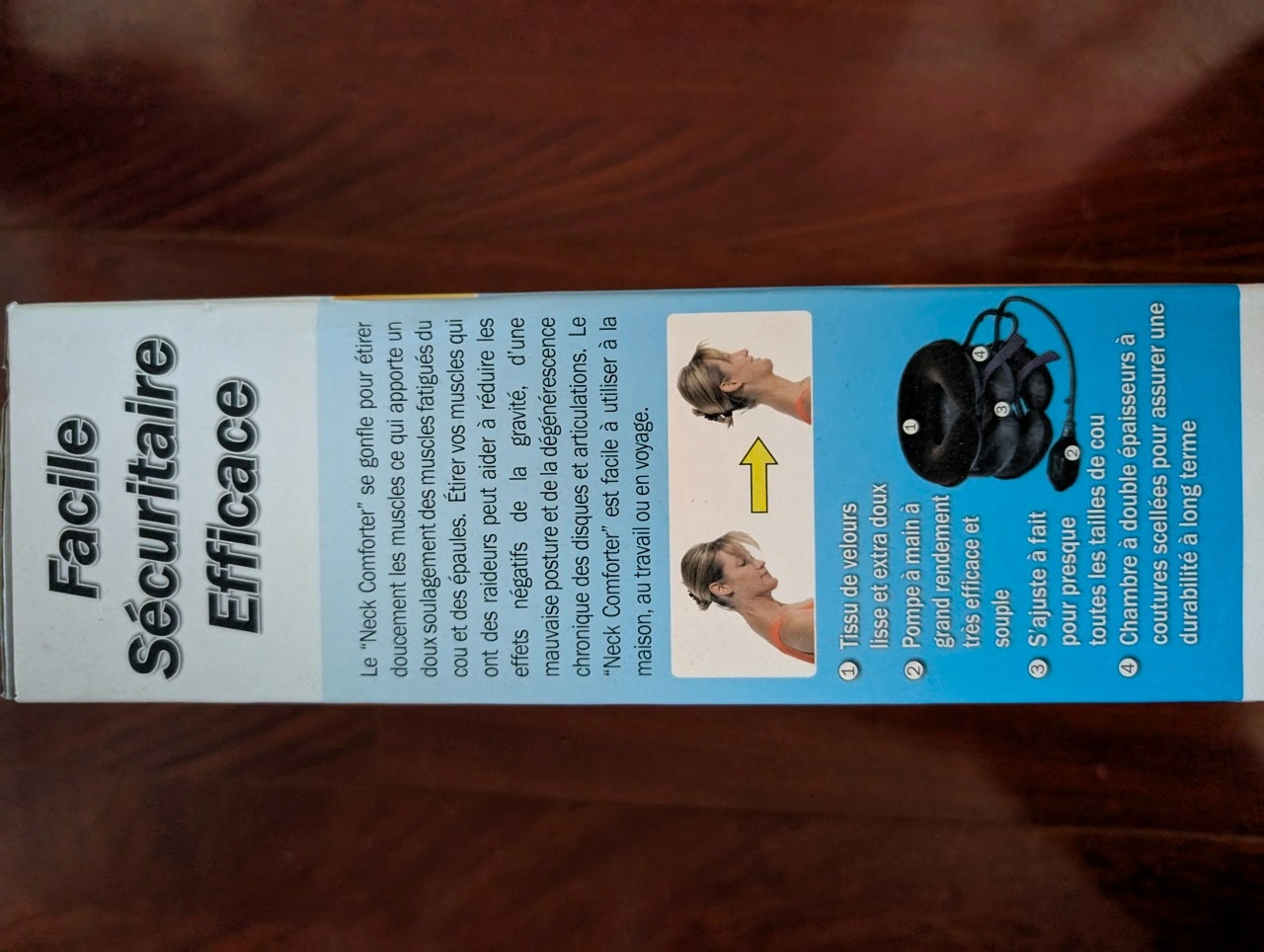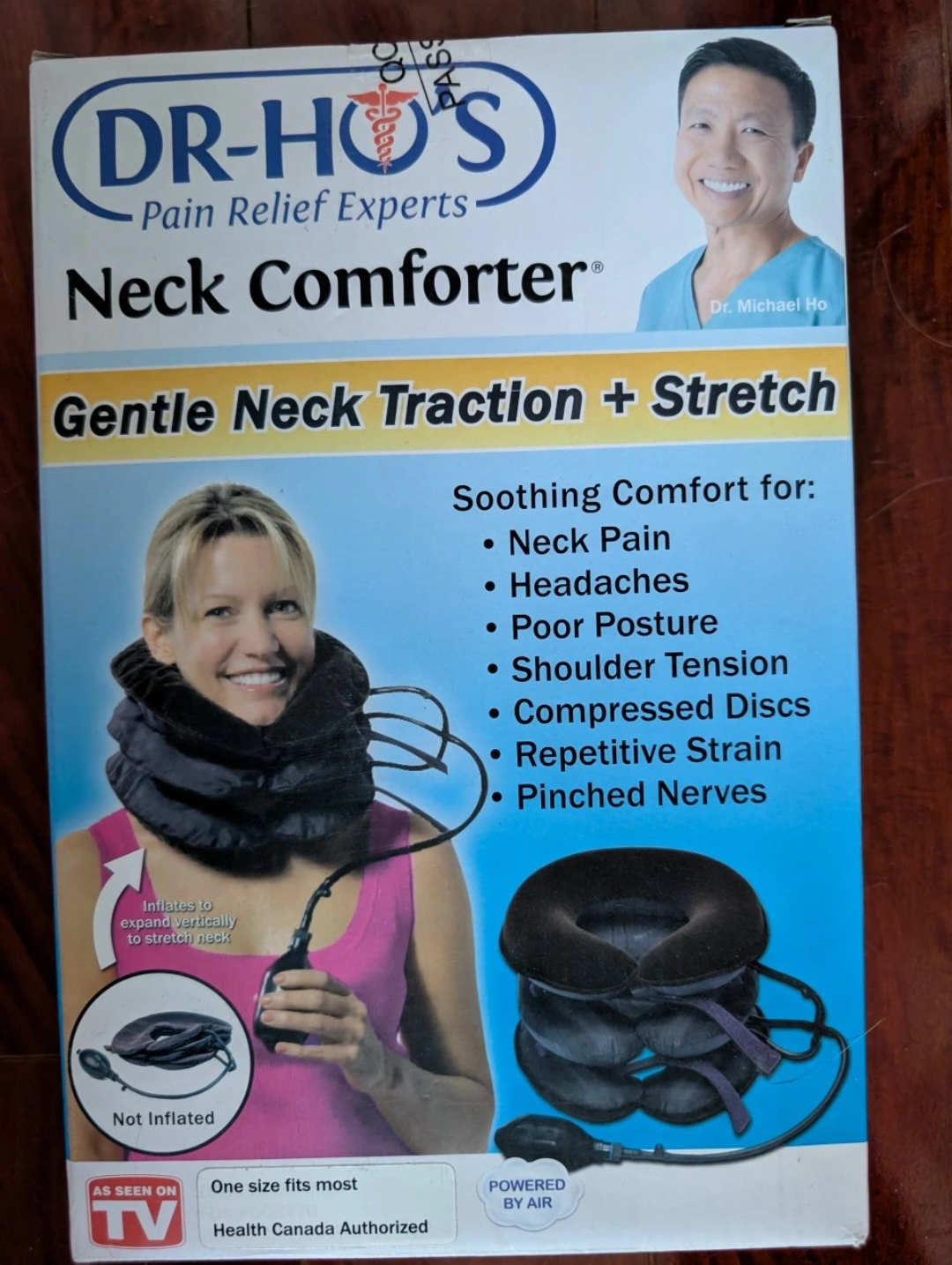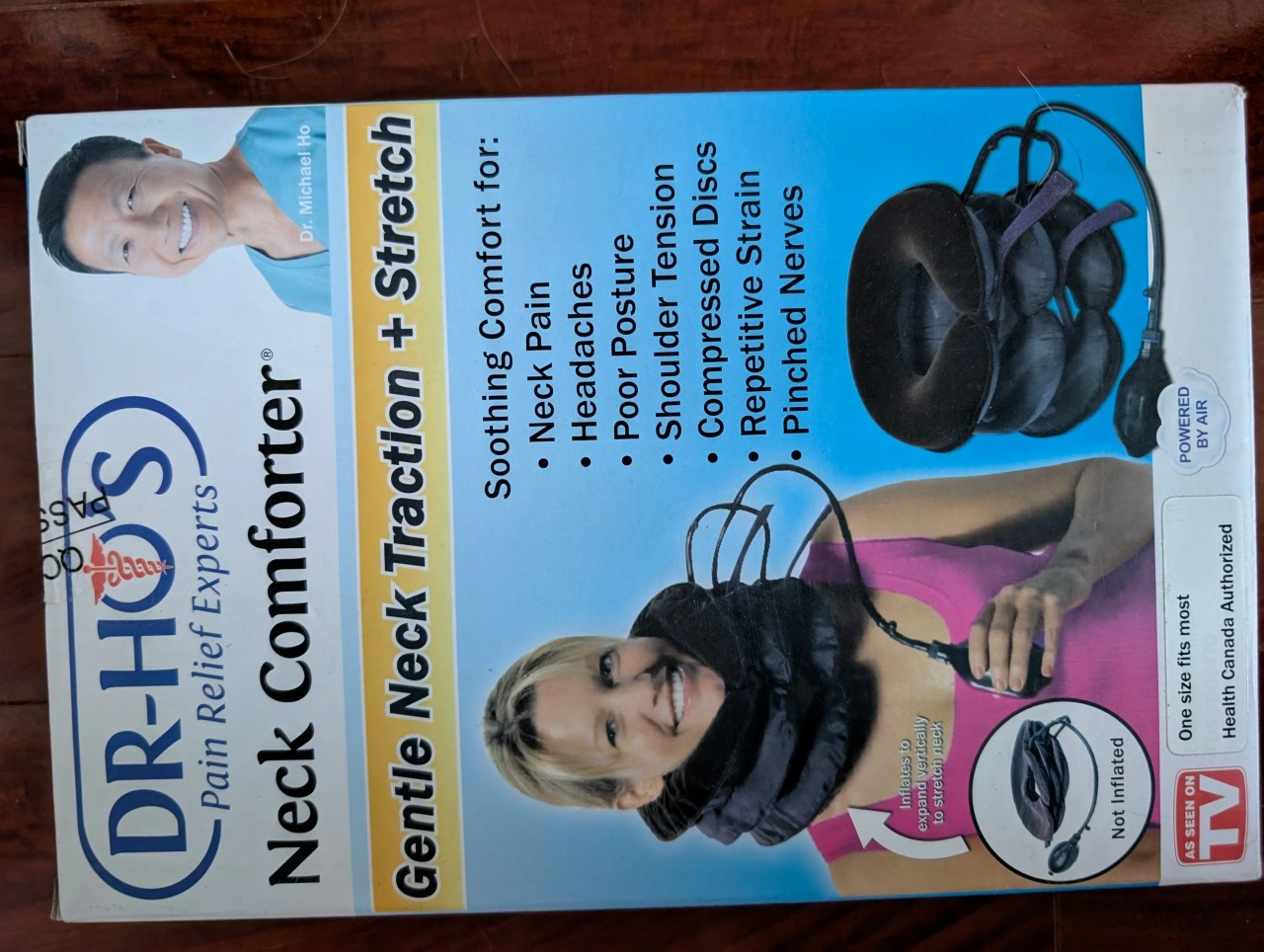 Gentle neck traction with a pump. Designed to stretch the neck. Perfect for home or travel, the item is also very easy to set up.