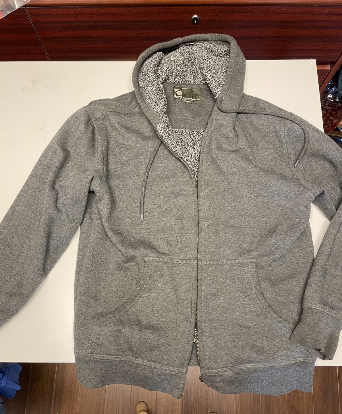 Grey hoodie with a fleece interior. Size S/P. Features a zipper closure and two pockets, shoulder to shoulder: 20”, chest: 22”, length: 26”, cash, self pickup. Cash, self pickup.