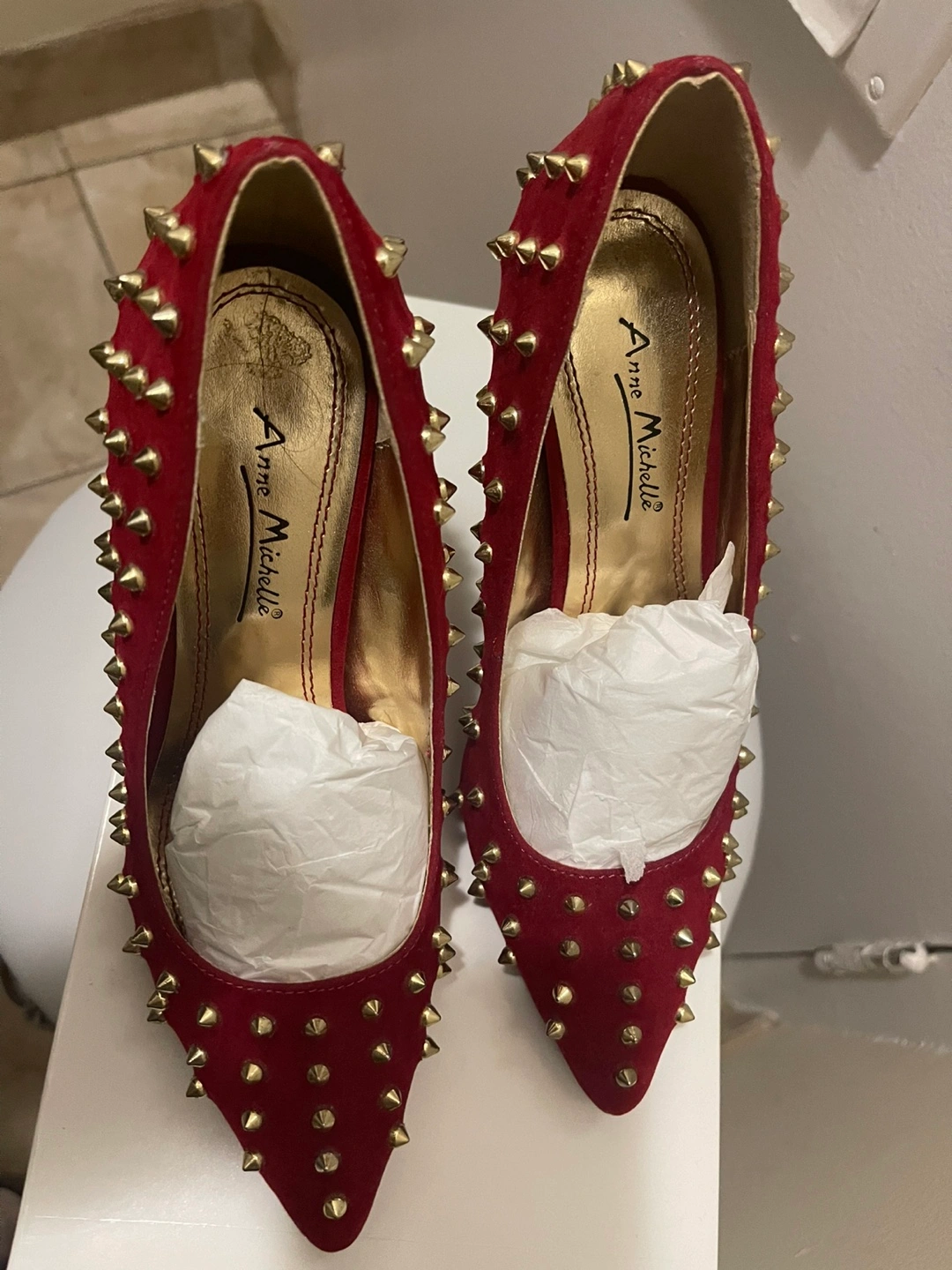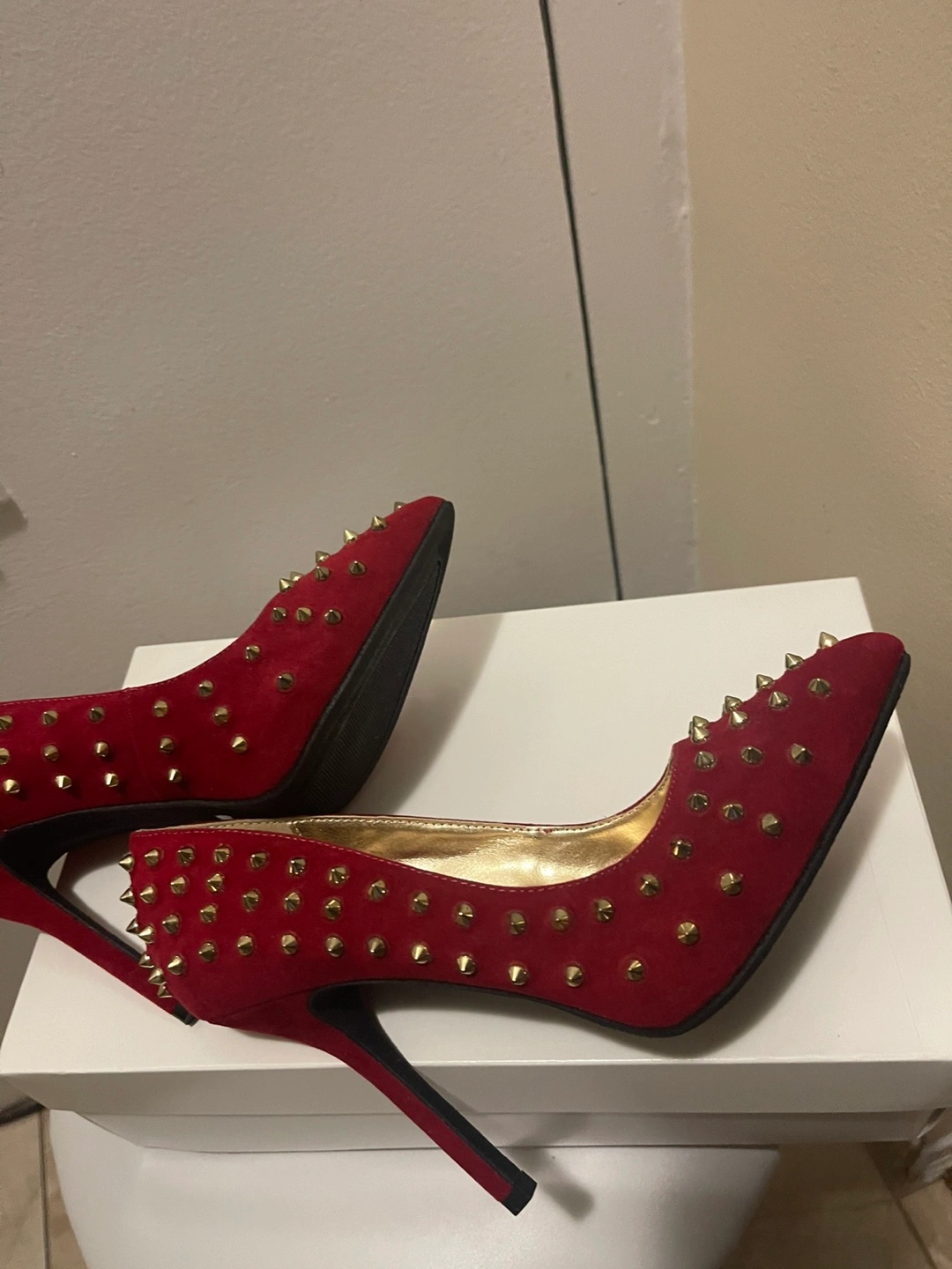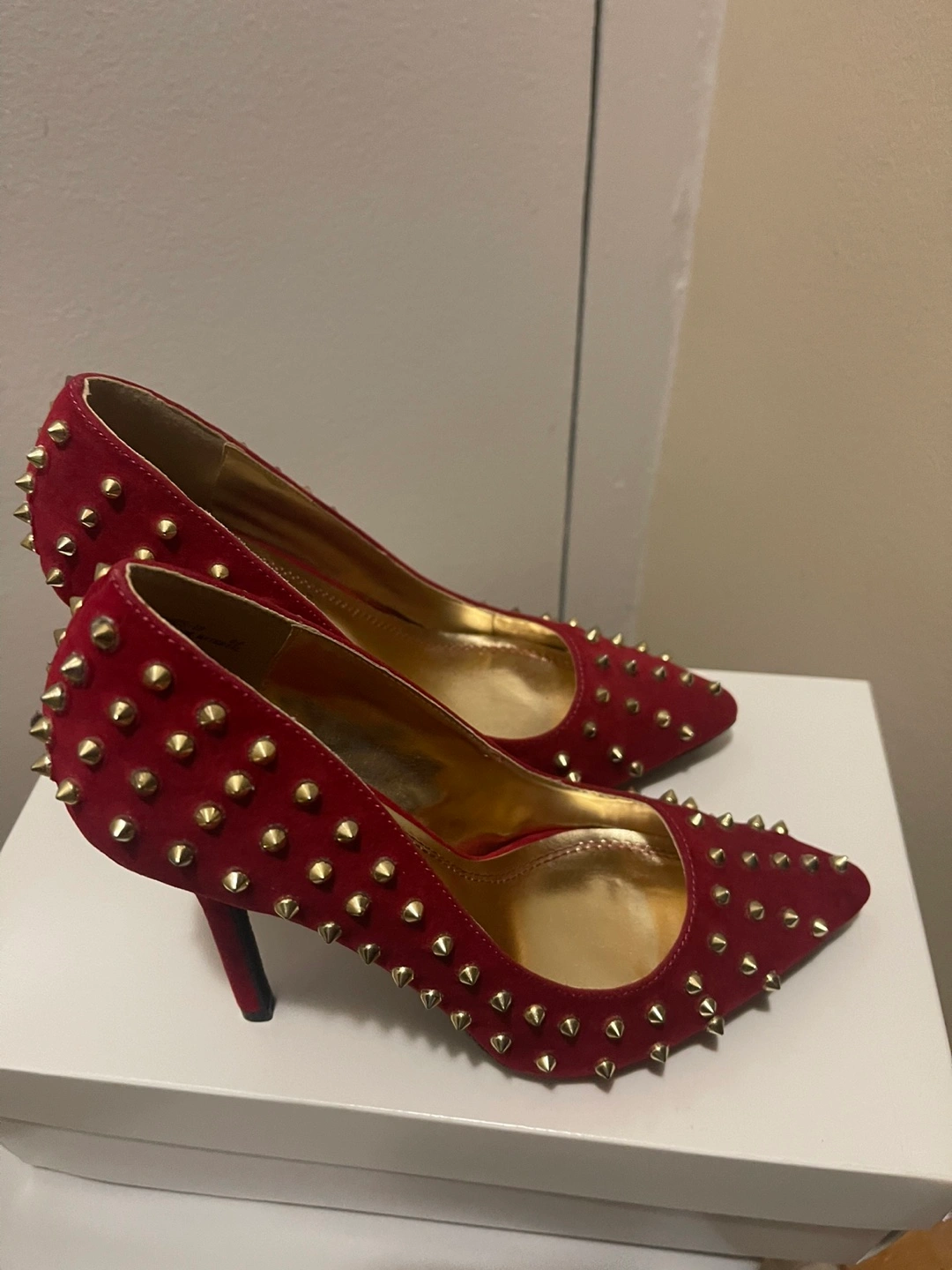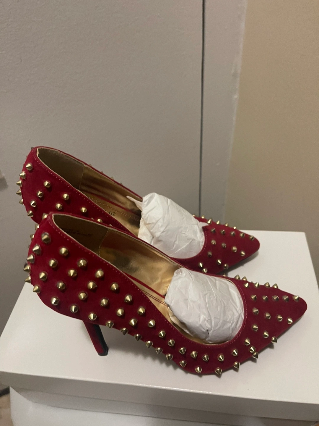 Red heels with pointed toes. Covered in gold studs. Paper stuffed inside. Perfect to wear for a night out with friends.