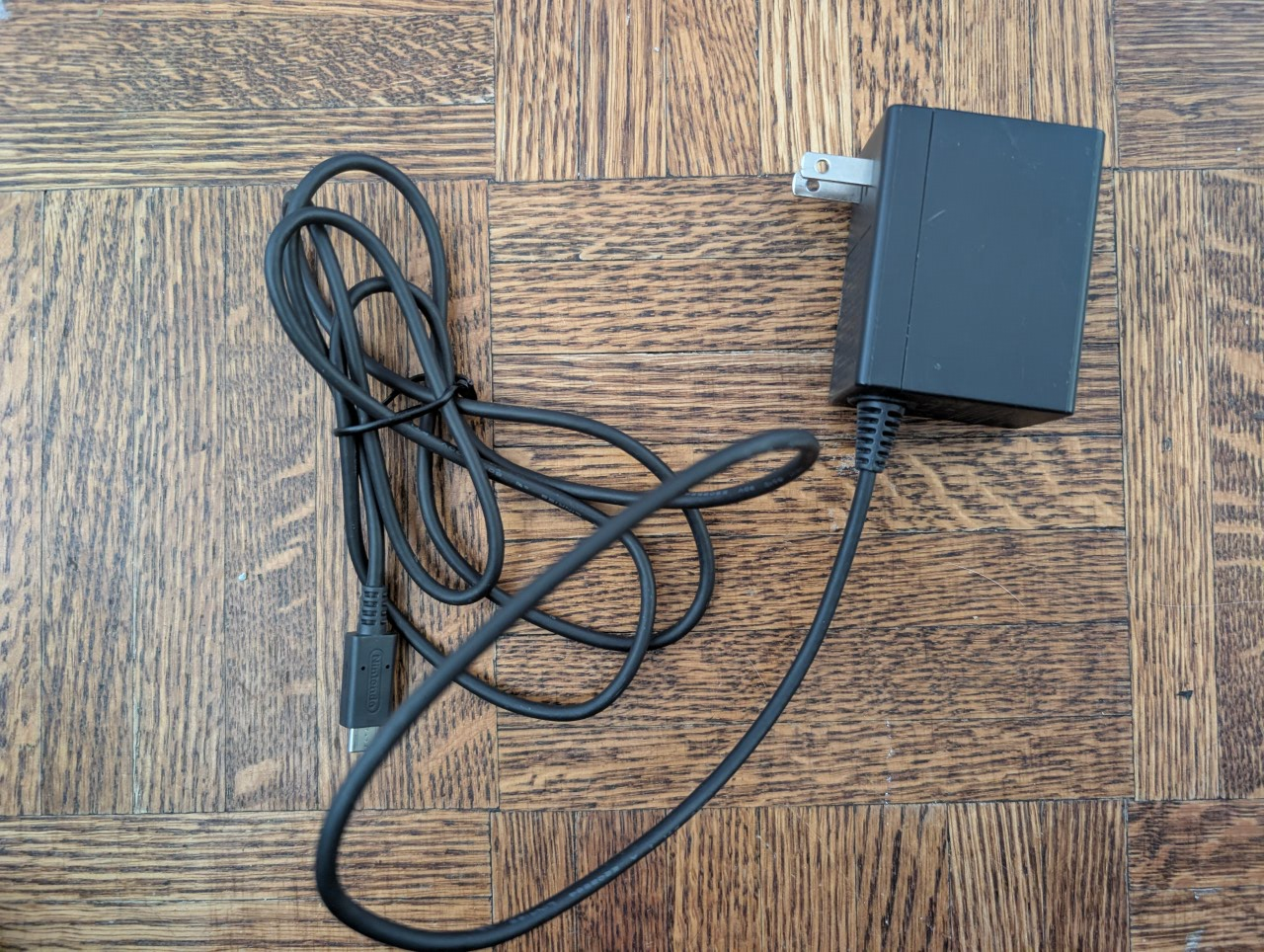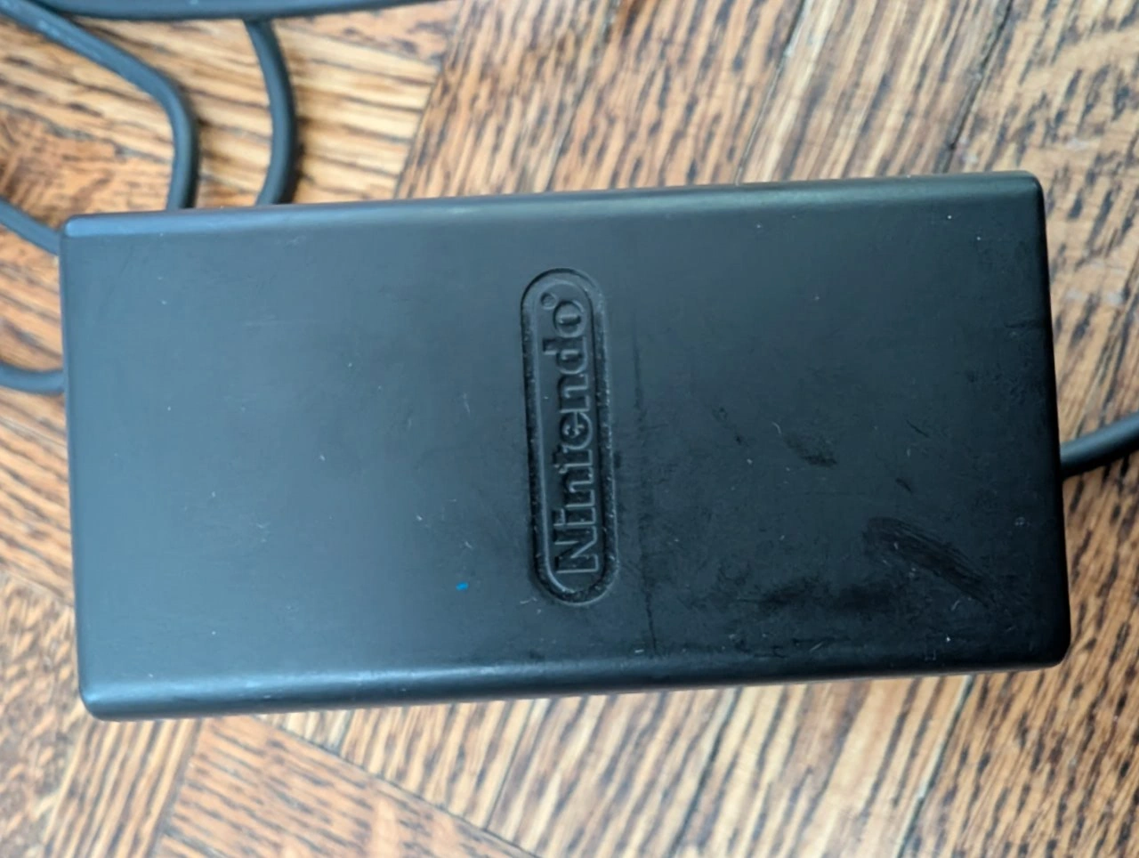A Nintendo AC adapter. Features a black body. It includes a cable with a USB-A connector. This is a great item for getting back into your favourite childhood games and is a great way to unwind.