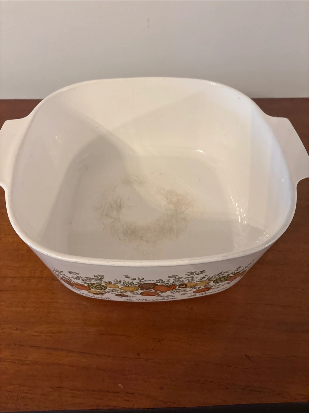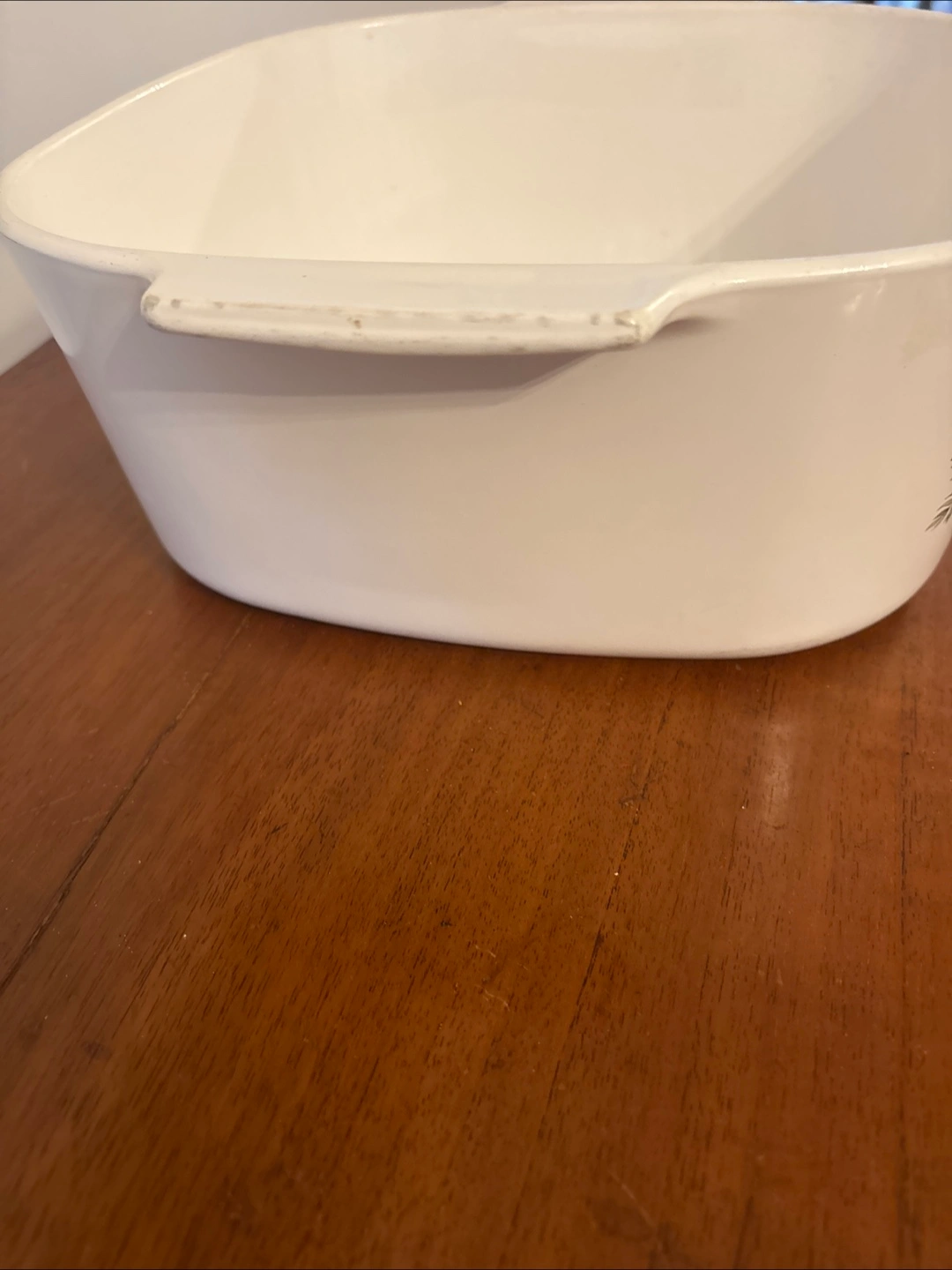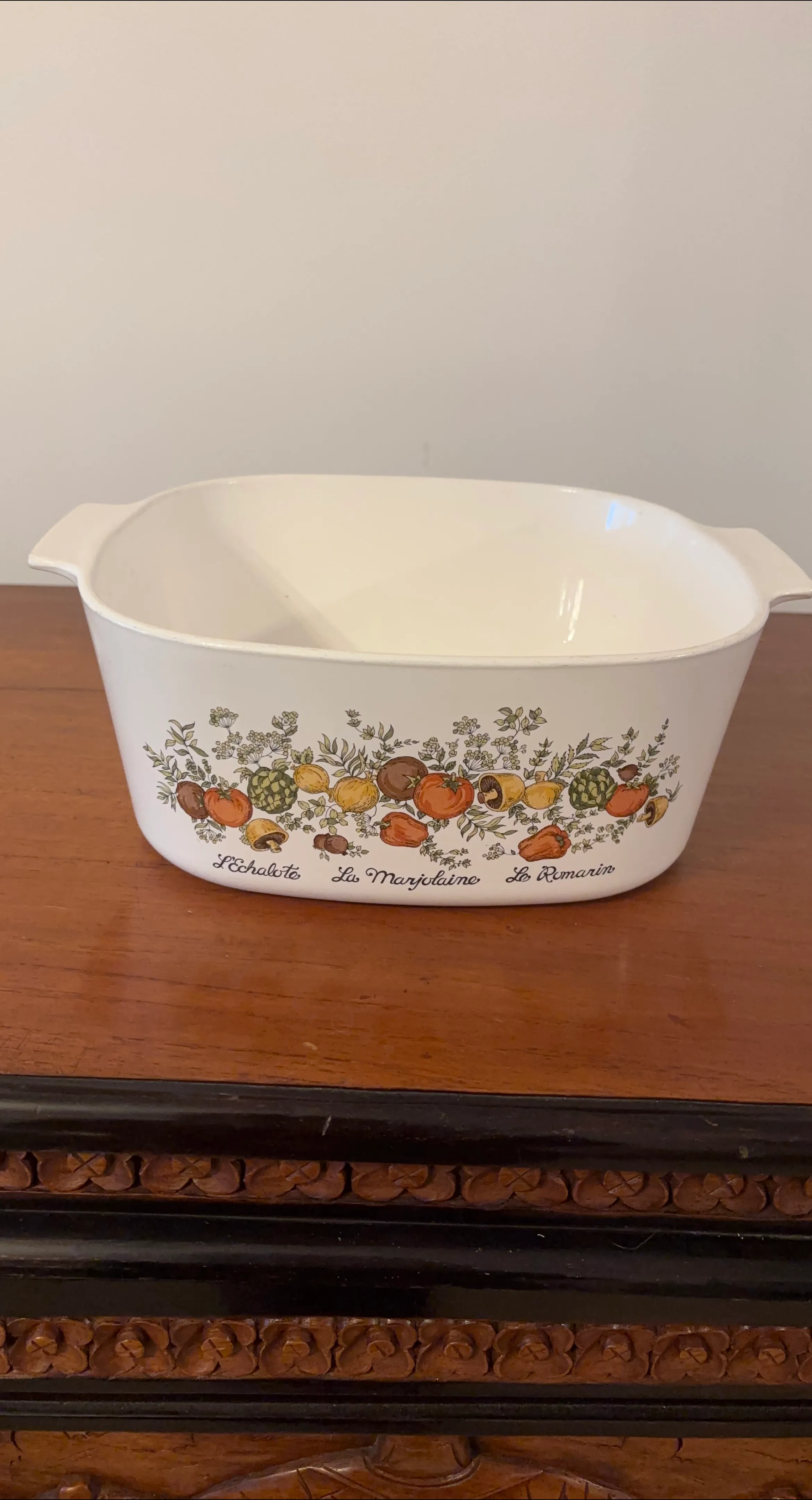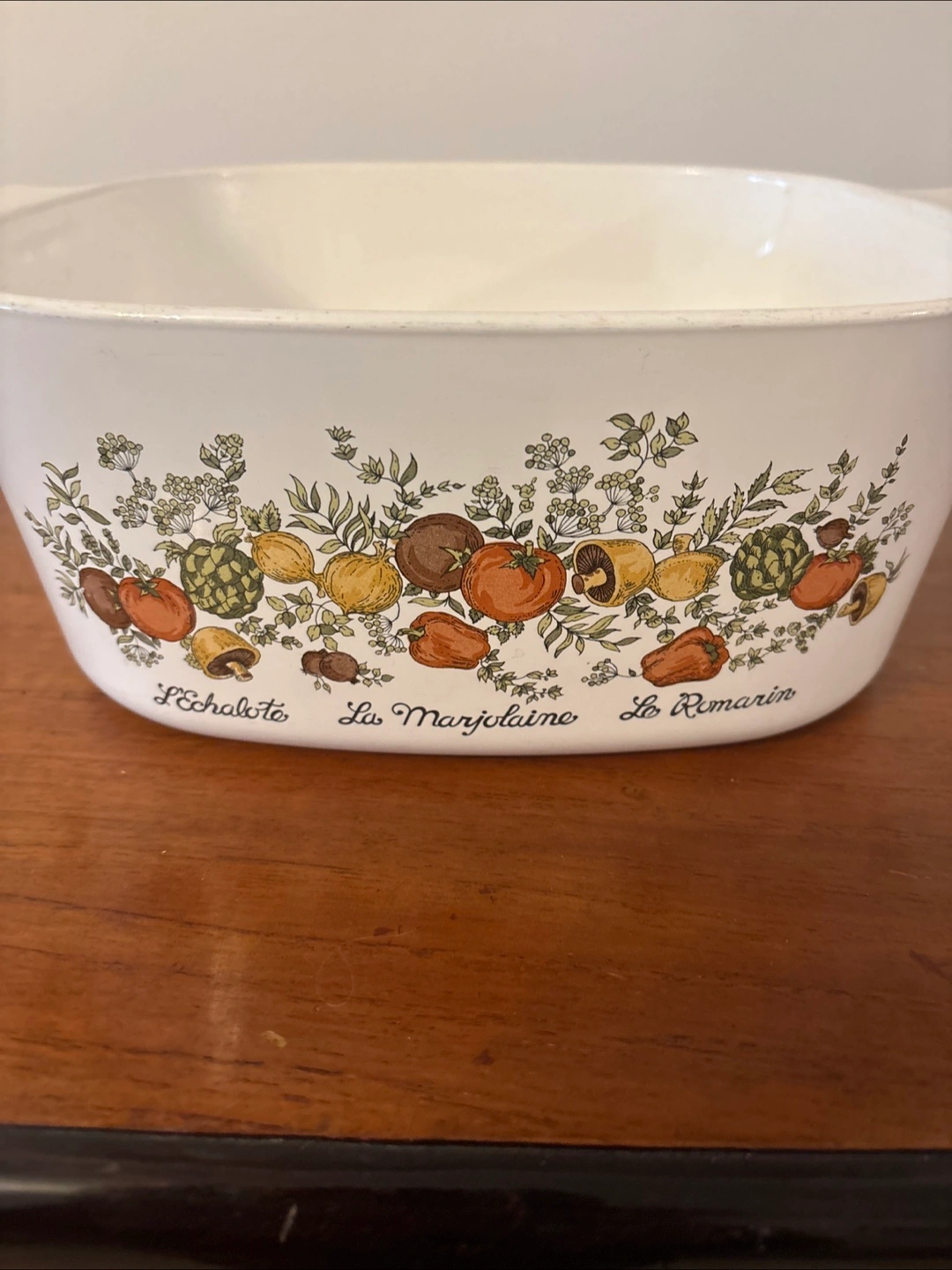 Large Baking dish with a rectangular shape. Has white color. Decorated with vegetables and herbs. A lovely dish to prepare your favorite casserole in.