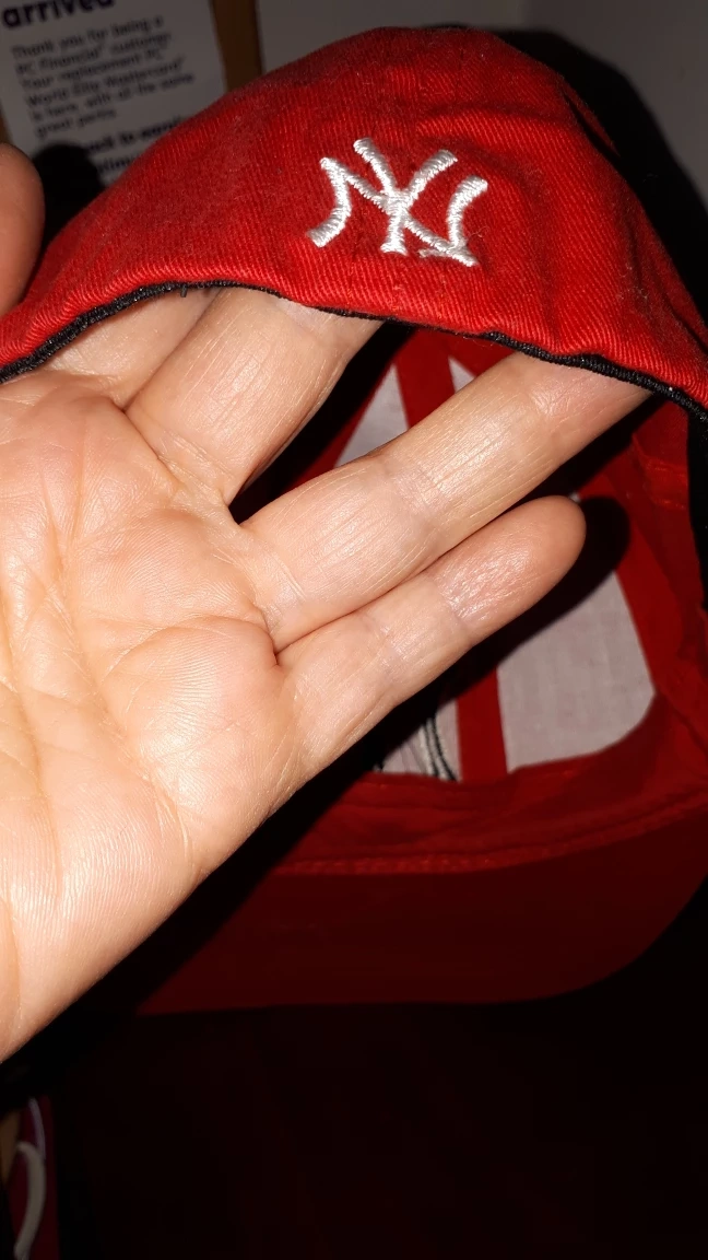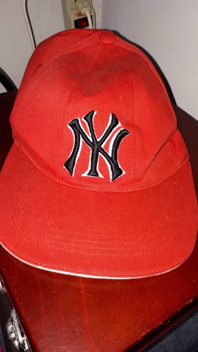 Red baseball cap with a curved bill. Features an embroidered logo on the front. Another logo present on the underside of the bill.