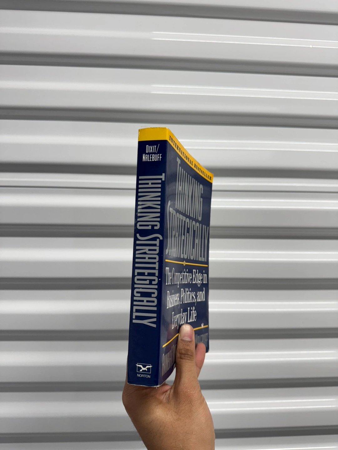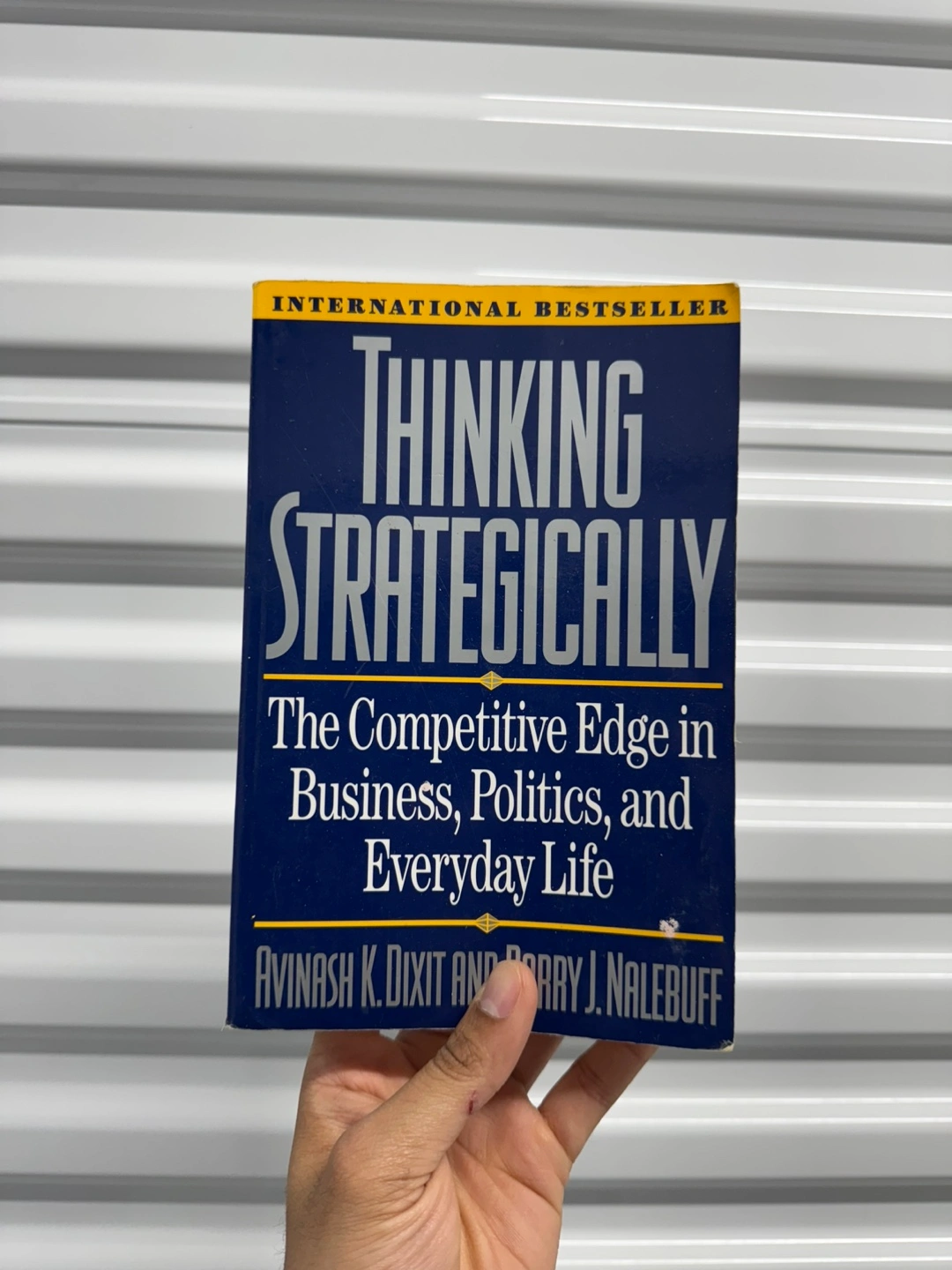 A book with a navy blue cover. The title appears in bold white text. Written by Avinash K. Dixit and Barry J. Nalebuff. A great way to learn about the competitive edge in different aspects of life, like business, politics, and everyday life.