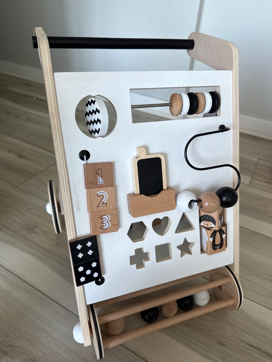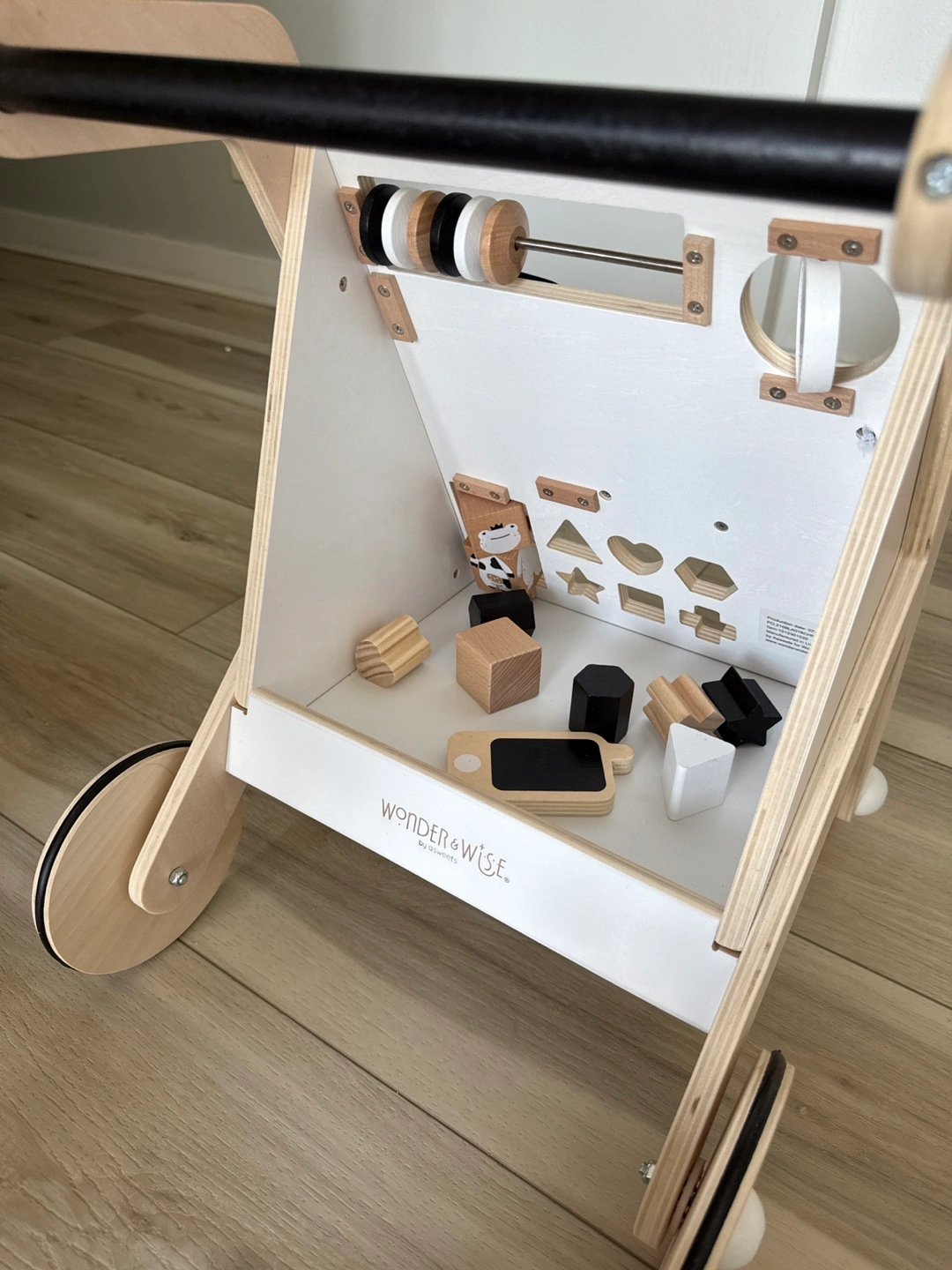 Perfect for babies and toddlers, the Wonder and Wise Activity Push Walker can be used while little ones walk, stand in place or sit. It's full of fun activities to stimulate the senses. Made from natural pinewood