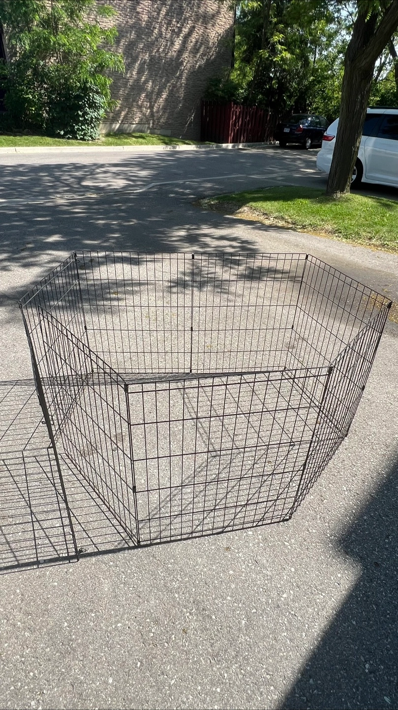 Metal playpen for pets. Hexagonal shape, folds away for storage. Perfect for keeping your pet safe while you relax outdoors, providing them with their own secure space.